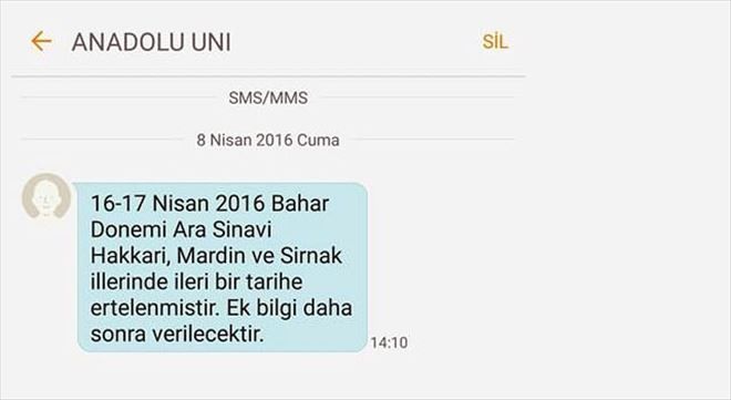 Anadolu Üniversitesi tarafından öğrencilerin Cep Telefonlarına gönderilen SMS´te: "16-17 Nisan 2016 Bahar Dönemi Ara Sınavı Hakkari, Mardin ve Şırnak illerinde ileri bir tarihe ertelenmiştir. Ek bilgi daha sonra verilecektir." açıklamasında bulundu.