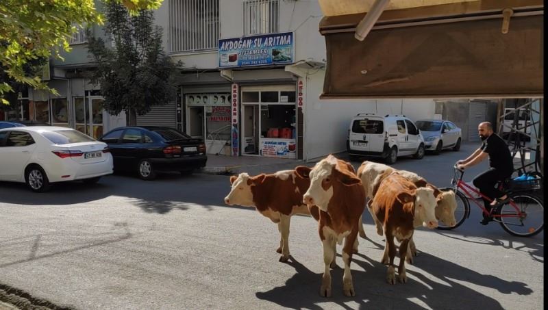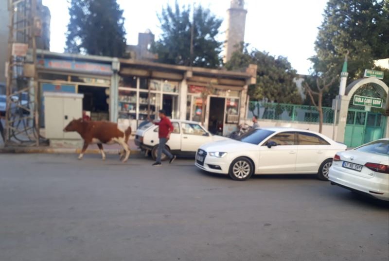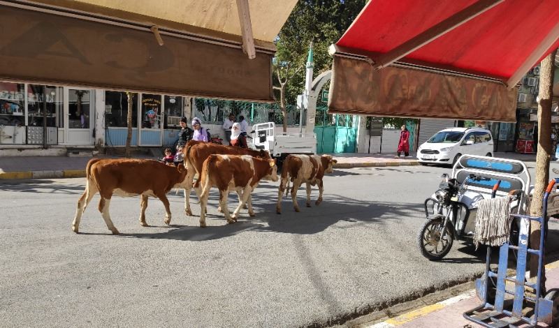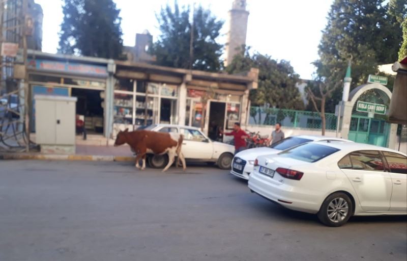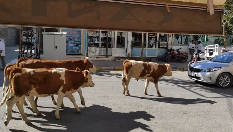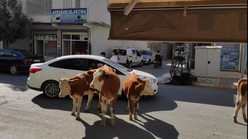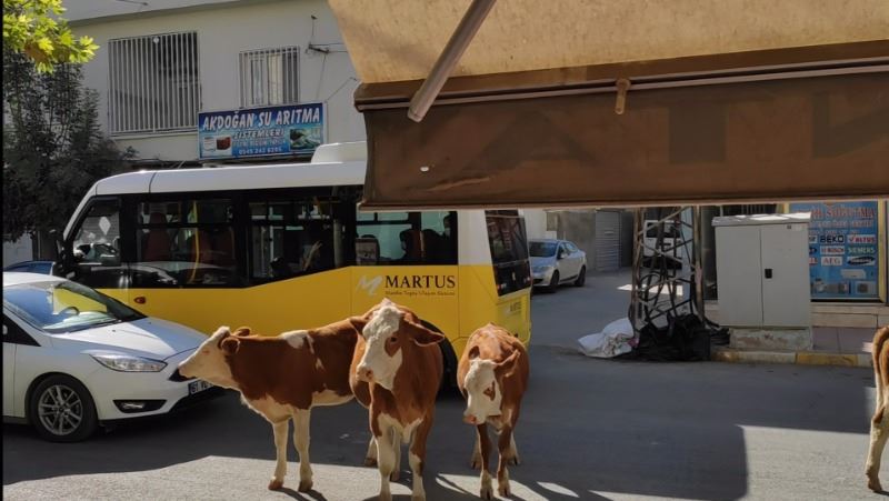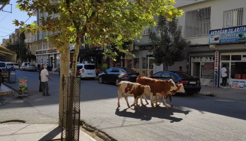 İlçenin Selahaddin Eyyubi ve Kışla mahalleleri arasındaki Midyat Caddede yürüyen ve zaman zaman duran inekler, araçlara aldırış etmeden trafiği olumsuz etkiledi.
