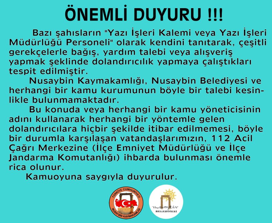 Bu konuda veya herhangi bir kamu yöneticisinin adını kullanarak herhangi bir yöntemle gelen dolandırıcılara hiçbir şekilde itibar edilmemesi, böyle bir durumla karşılaşan vatandaşlarımızın, 112 Acil Çağrı Merkezine (İlçe Emniyet Müdürlüğü ve İlçe Jandarma Komutanlığı) ihbarda bulunması önemle rica olunur.