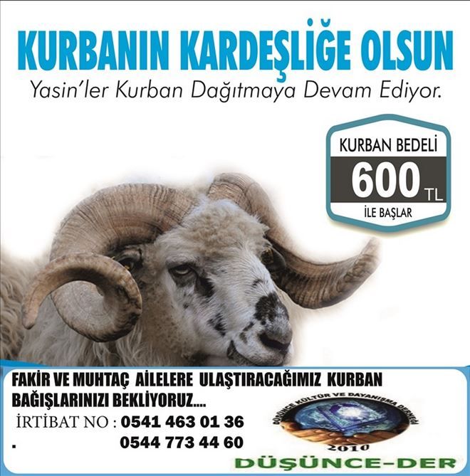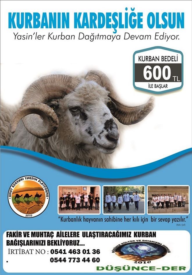 bu vesile ile halkımız ve kurban kesen kardeşlerimiz arasında köprü olmak istiyoruz. Sizden gelecek olan kurbanları sizin adınıza halka ulaştırmak istiyoruz şimdiden kestireceğiniz kurbanların kabul olması ve kardeşliğe vesile olması dileğiyle kurban bayramınızı tebrik eder halkımıza hayırlar getirmesine vesile olmasını yüce Allahtan niyaz ederiz?