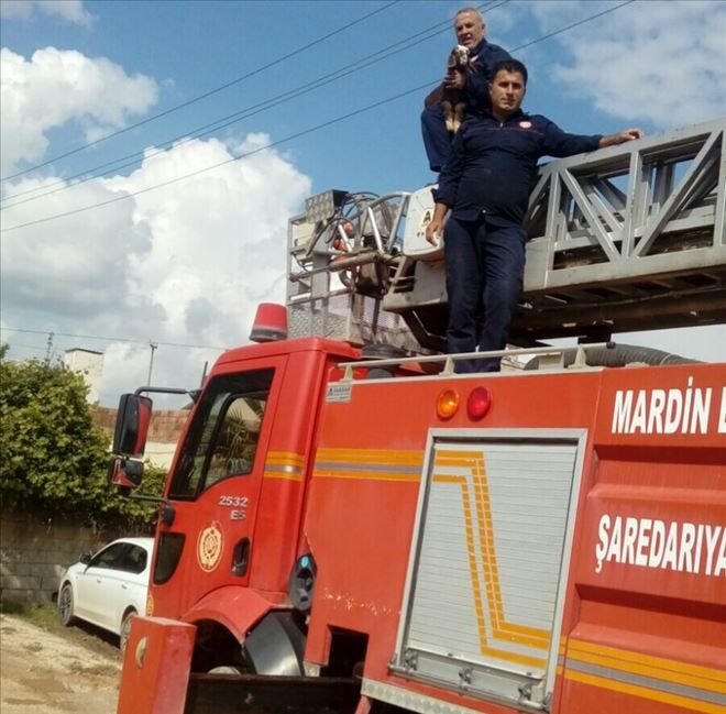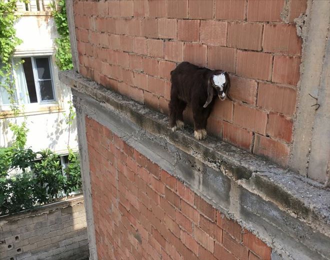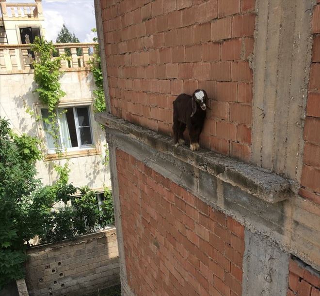 Mardin´in Nusaybin ilçesinde, 3 katlı bir inşaatın ikinci katındaki çıkıntıda mahsur kalan oğlak, itfaiye ekipleri kurtardı.