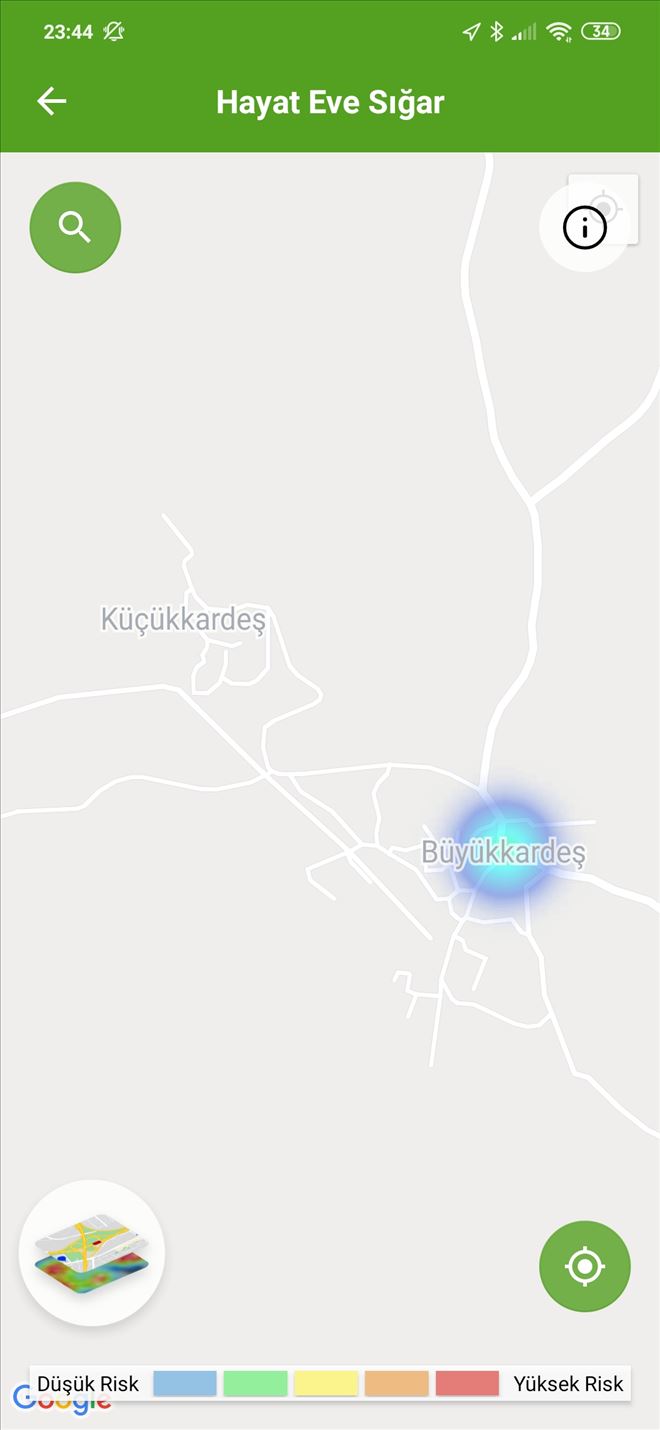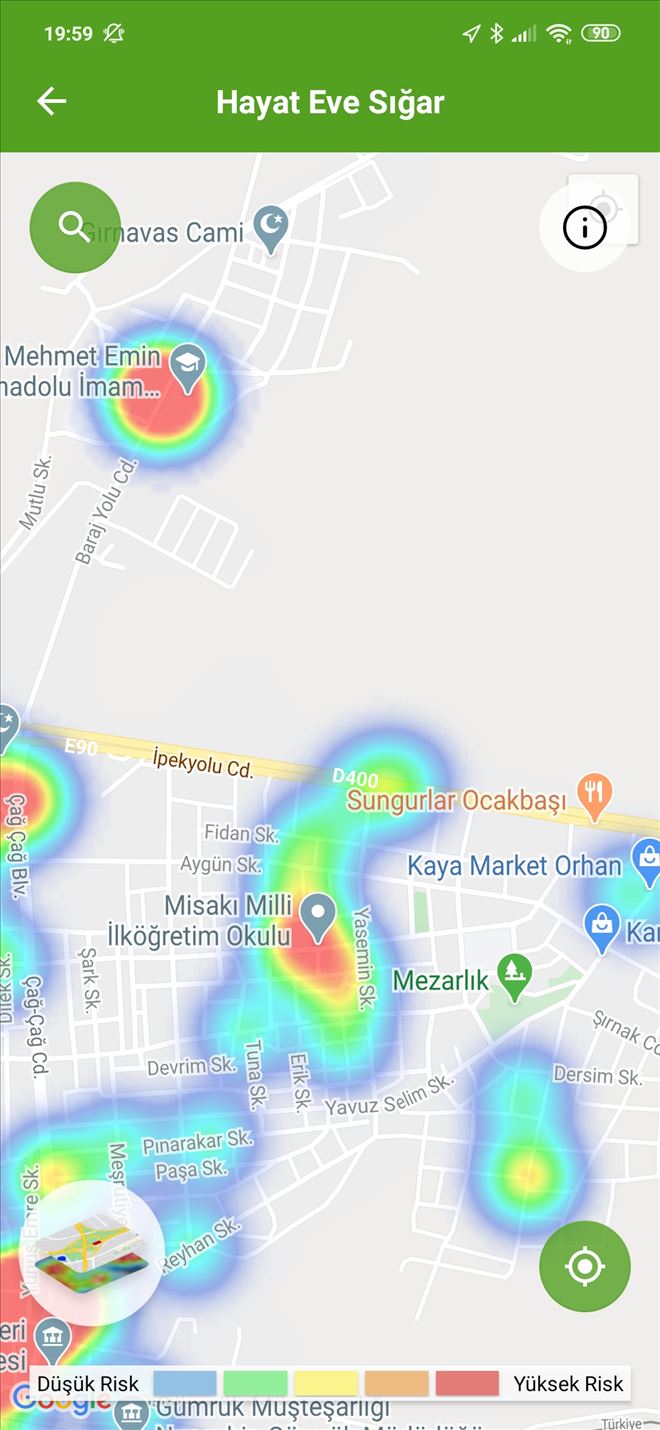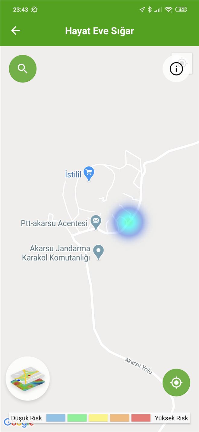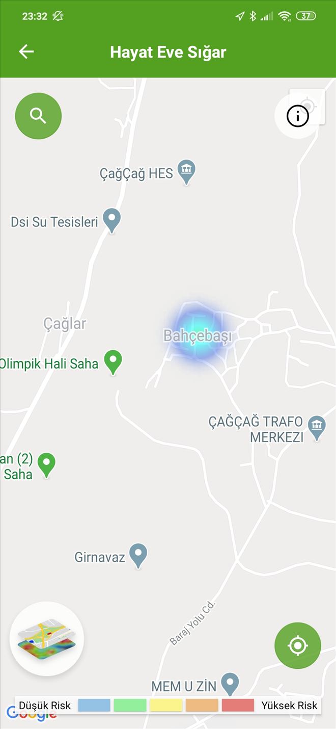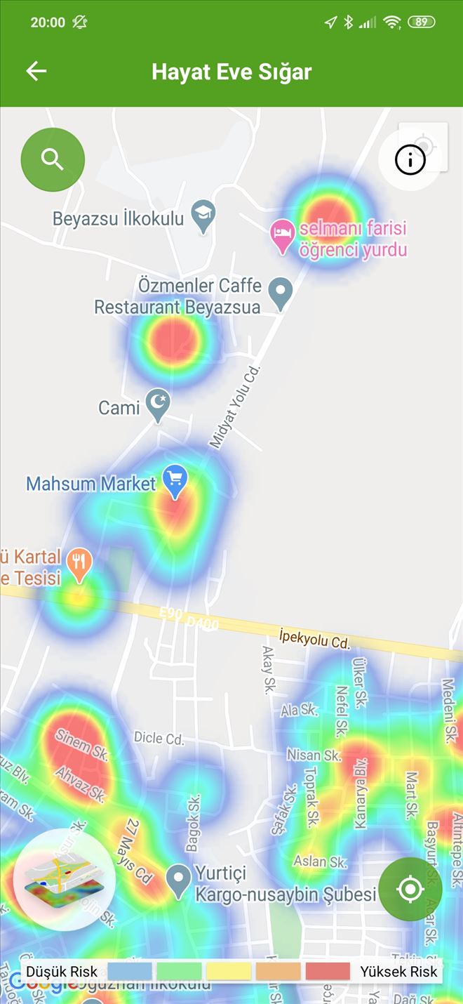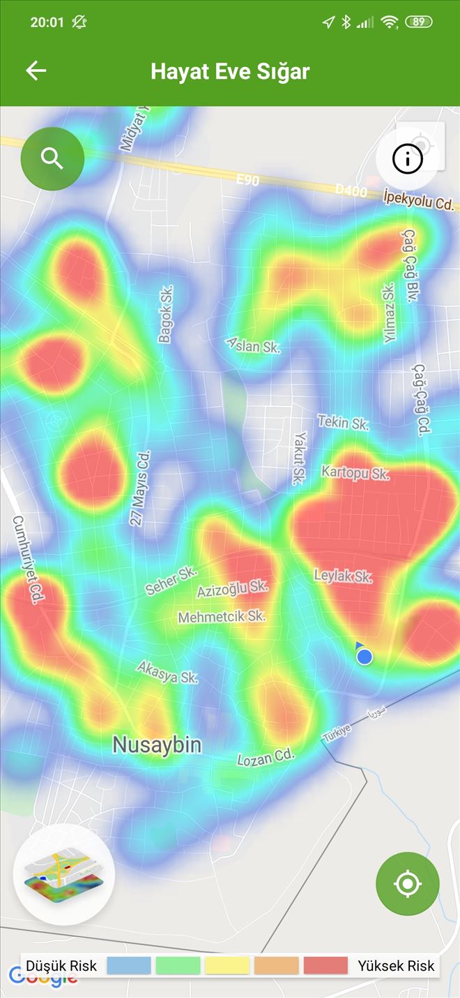 Uygulamaya göre kırmızı alanlar yüksek riskli alanları gösterirken, mavi alanlar ise düşük riskli bölgeleri temsil ediyor.