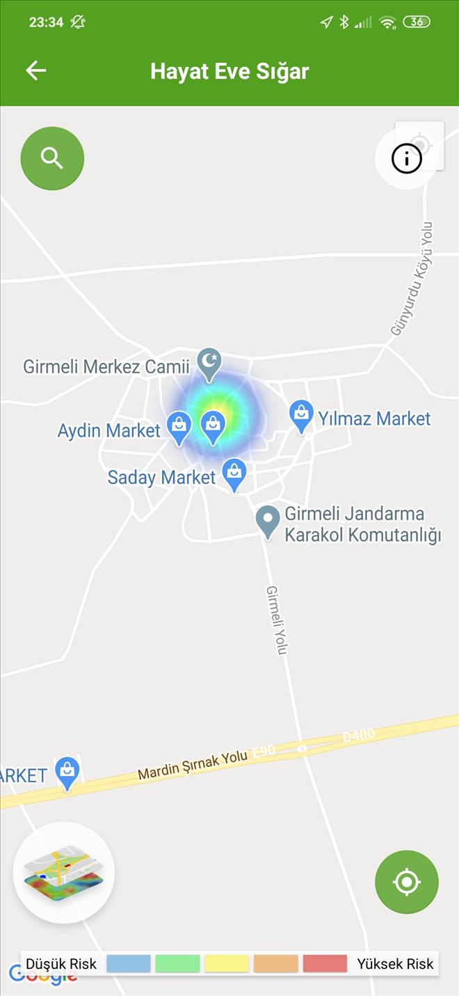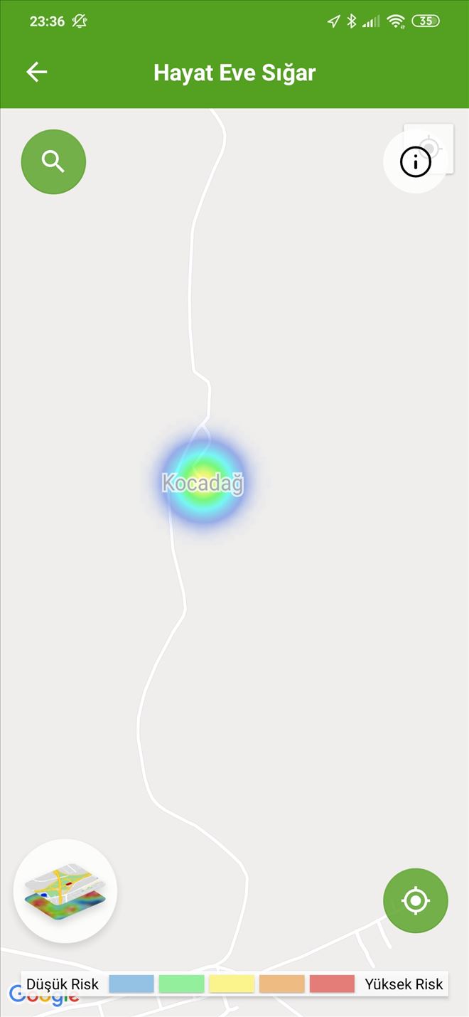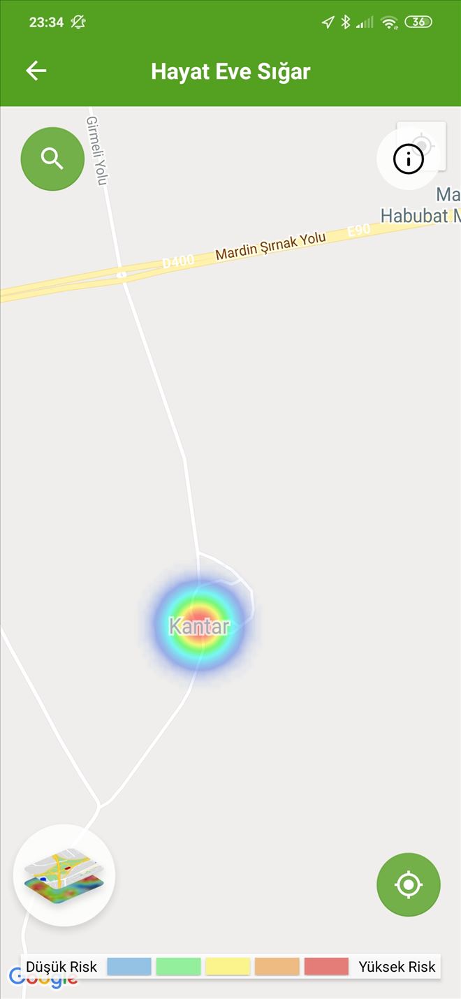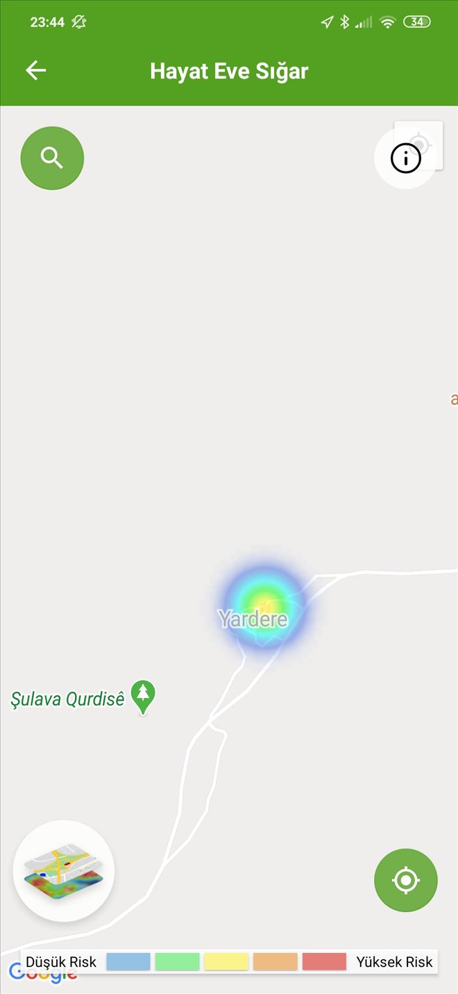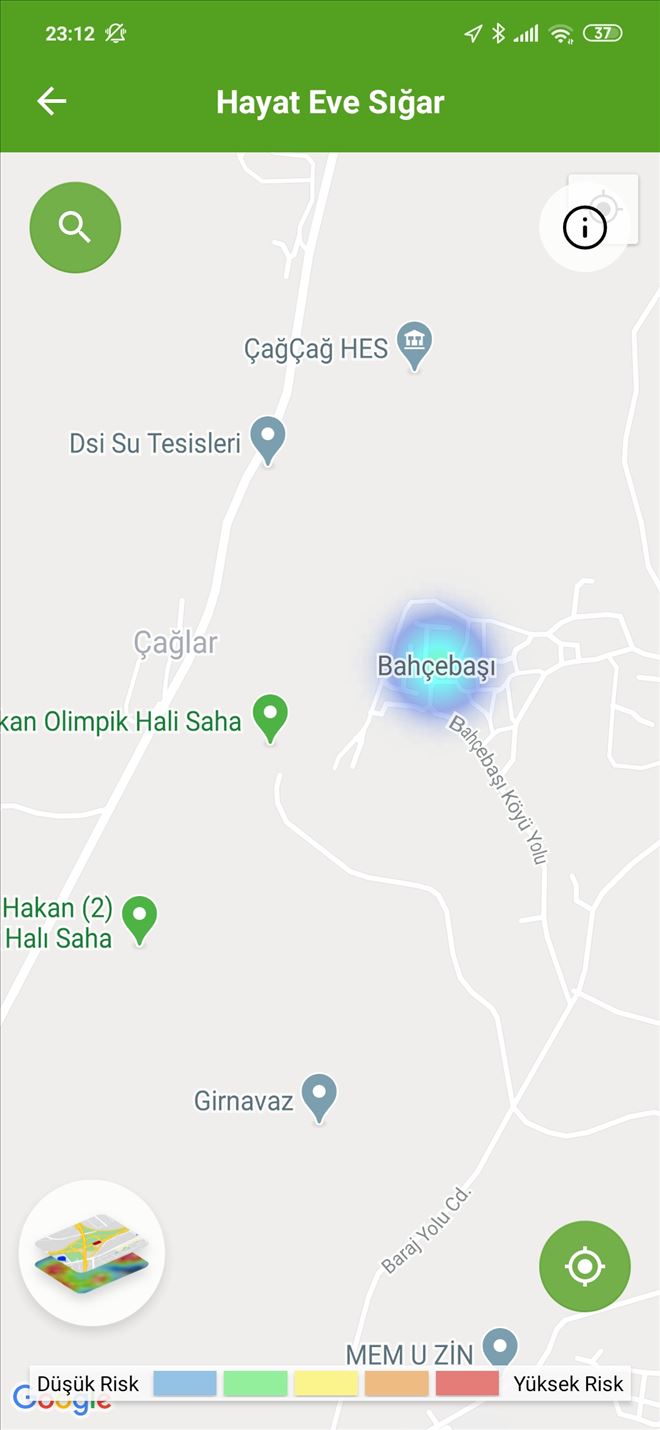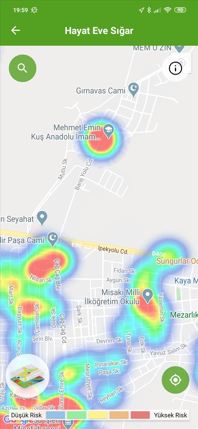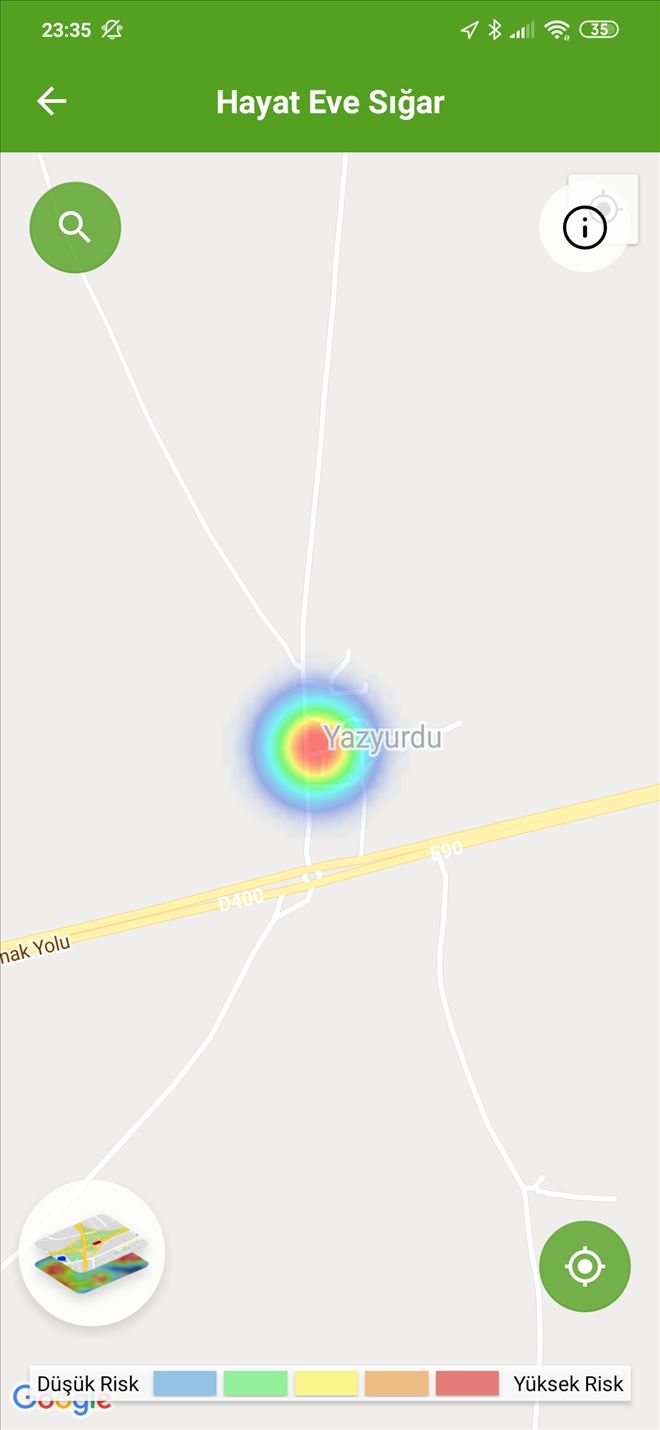 Uygulamaya göre kırmızı alanlar yüksek riskli alanları gösterirken, mavi alanlar ise düşük riskli bölgeleri temsil ediyor.