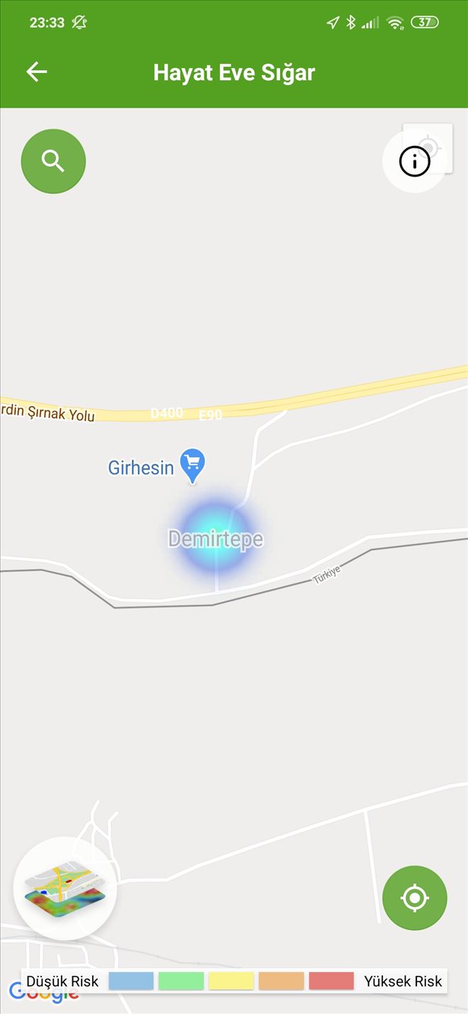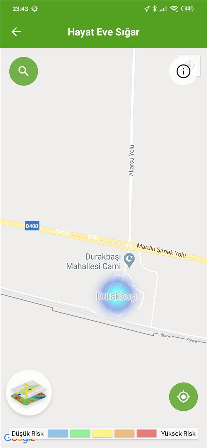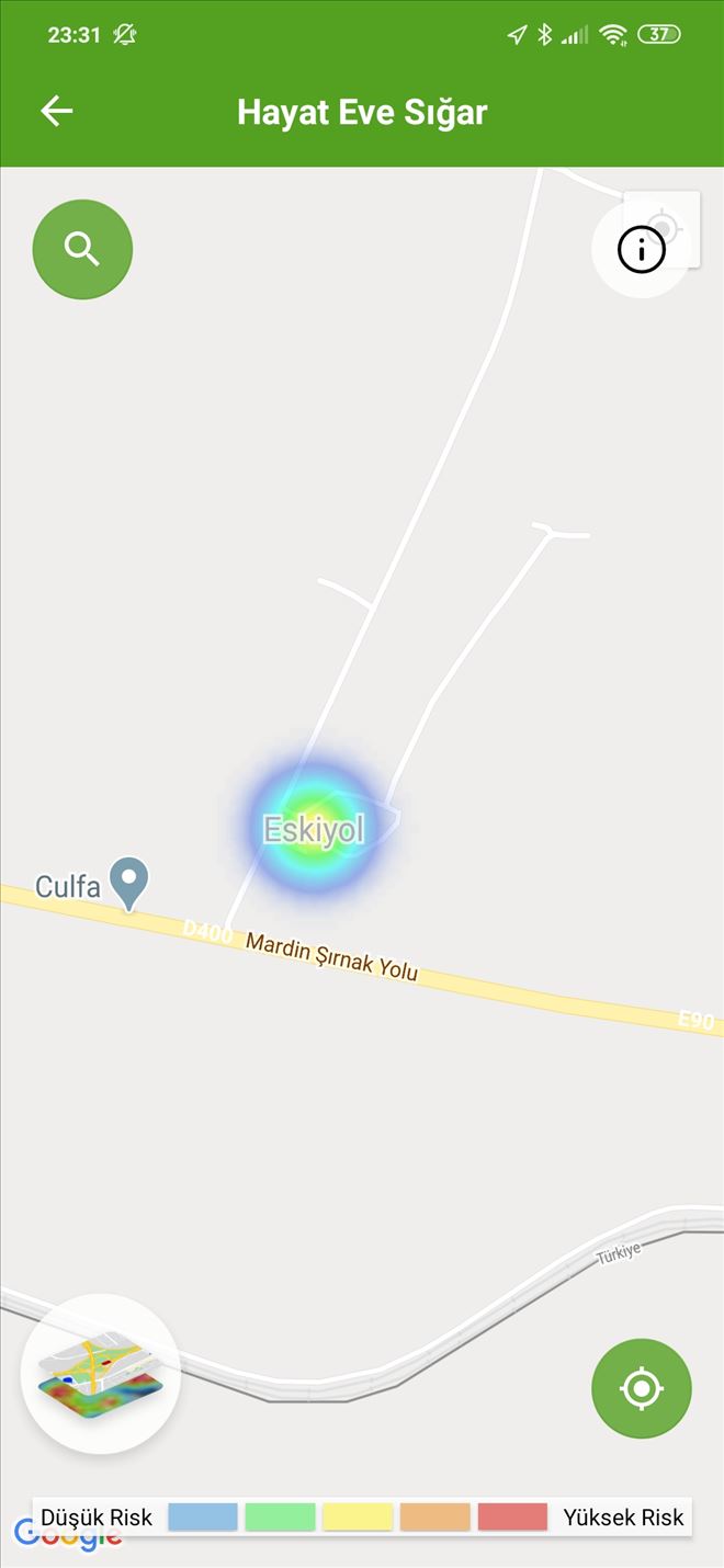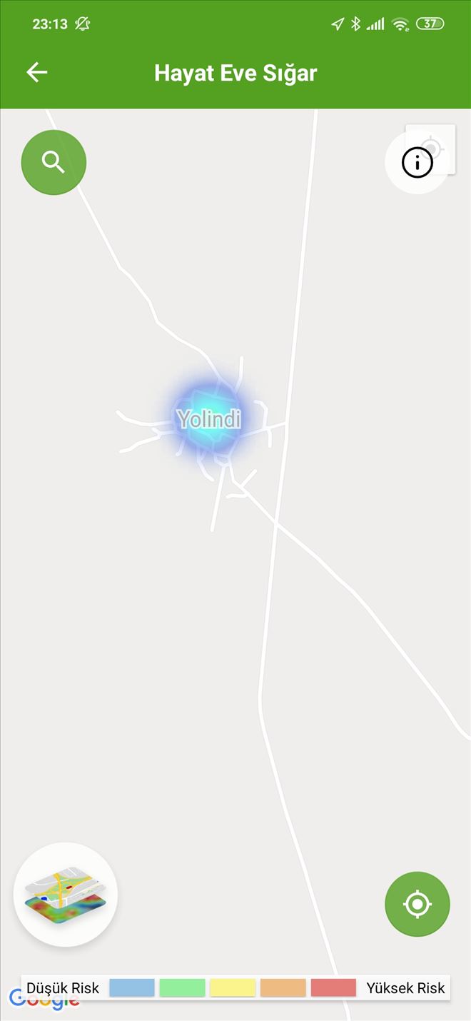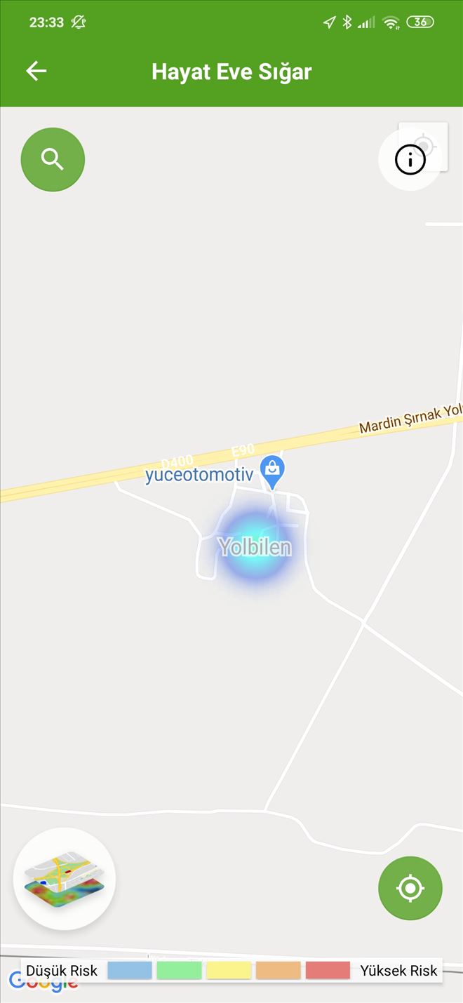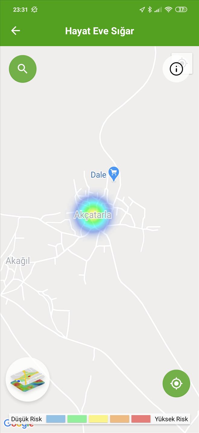 Uygulamaya göre kırmızı alanlar yüksek riskli alanları gösterirken, mavi alanlar ise düşük riskli bölgeleri temsil ediyor.