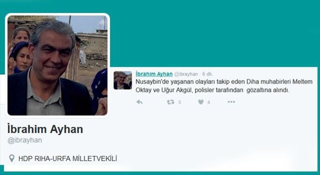 Daha önce yaptığı açıklamada Nusaybin´de olduğunu kaydeden Ayhan, Twitter hesabından yaptığı açıklamada: "Nusaybin´de yaşanan olayları takip eden Diha muhabirleri Meltem Oktay ve Uğur Akgül, polisler tarafından gözaltına alındı." dedi.