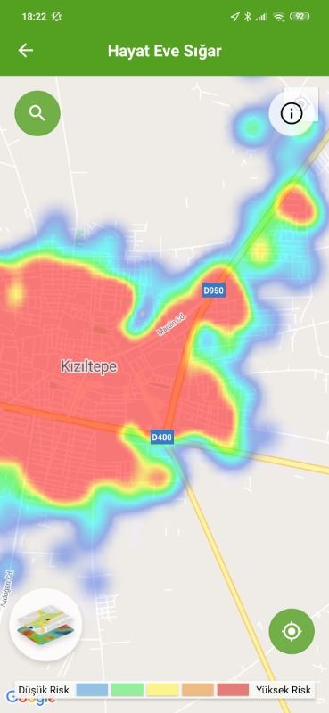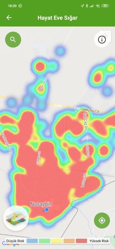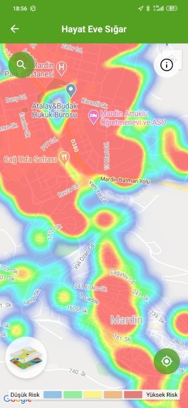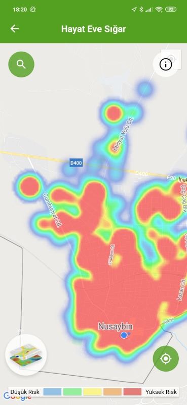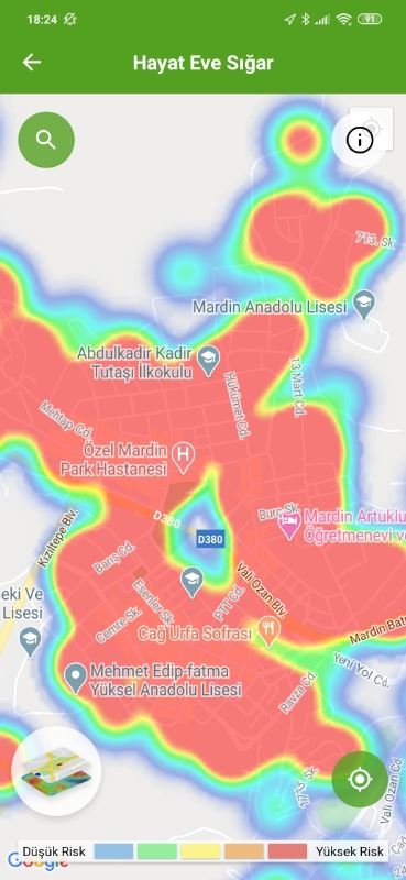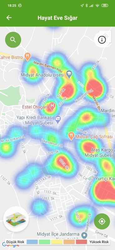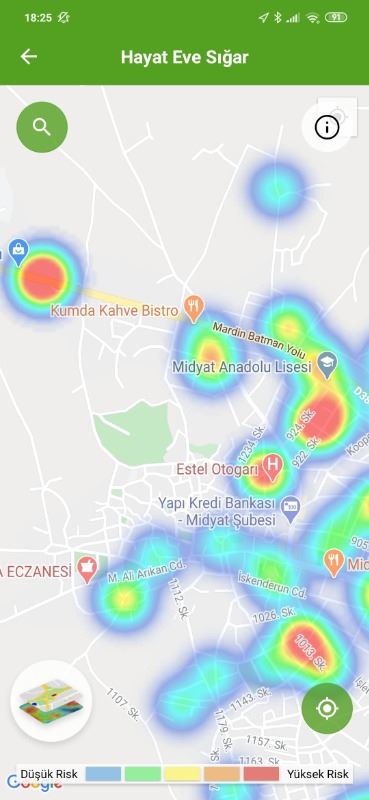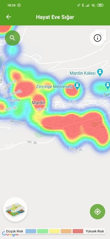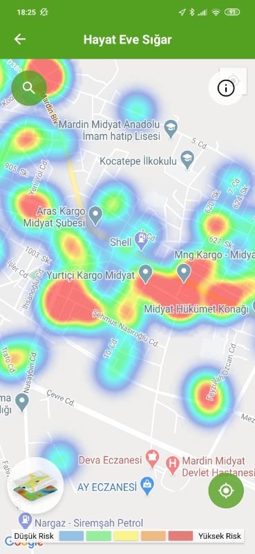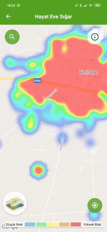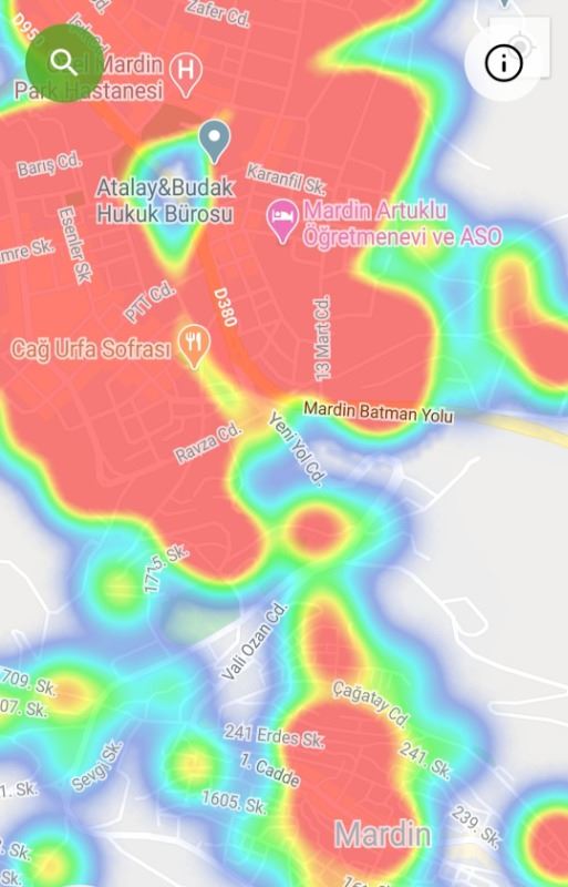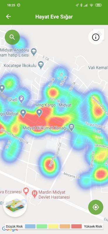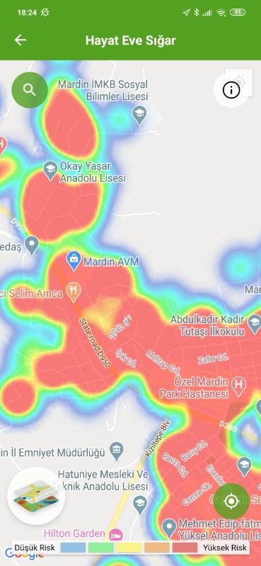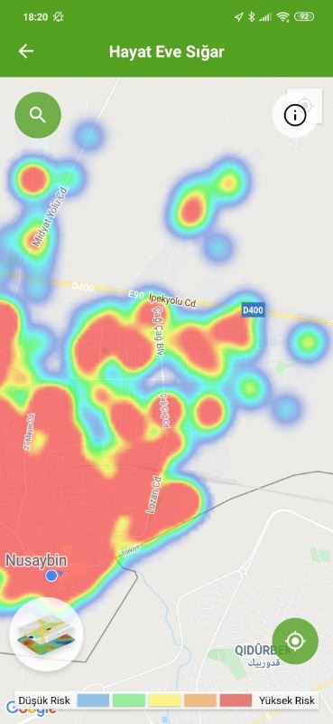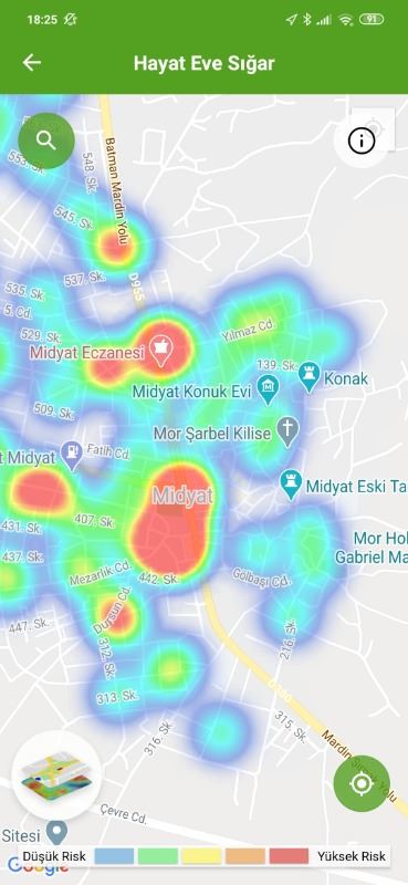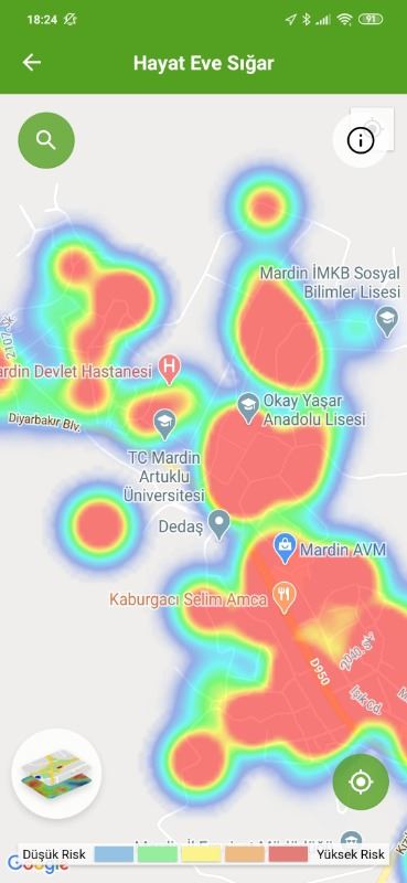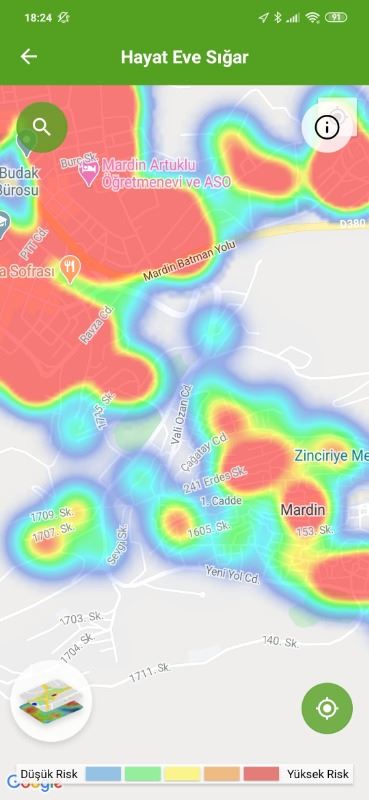 Mardin ili ve Nusaybin, Kızıltepe ilçelerin Hayat Eve Sığar uygulamasındaki Kovid-19 haritası fotoğraflarla aşağıdaki gibidir.