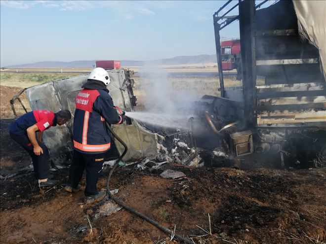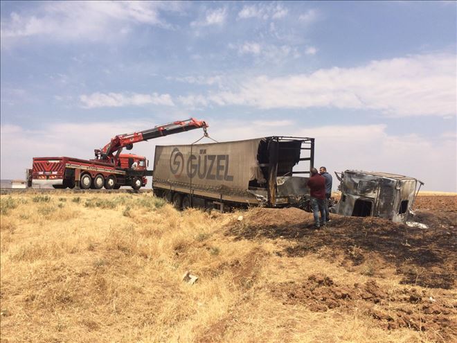 Kupası tamamen yanan tır kullanılmaz hale gelirken bölgeye gelen vinç yarımıyla tır kaldırıldı.