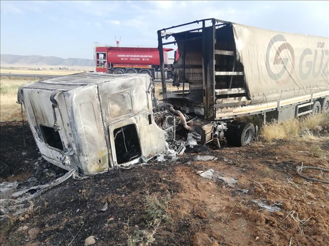 Mardin´in Nusaybin ? Cizre ilçeleri arası İpekyolu´nda hareket halindeki tır alev aldı. Tır kullanılmaz hale geldi.