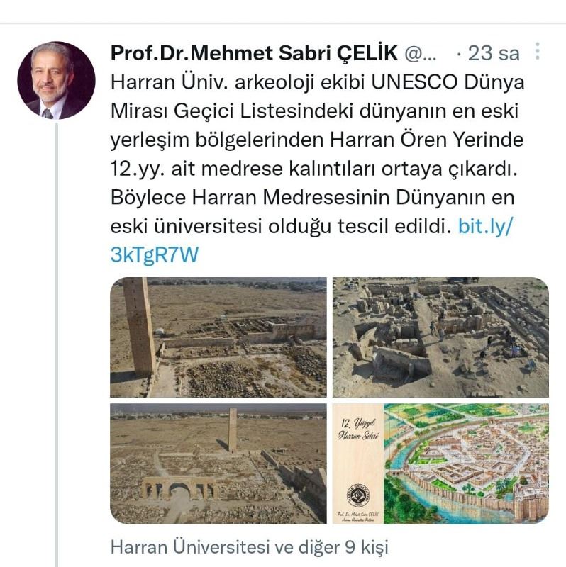 Belgesel çekimleri sonrası Nusaybin Kaymakamı ve Belediye Başkan Vekili Ercan Kayabaşı ile Harran Kaymakamı Cihat Koç arasında yaşanan ‘İlk Üniversite’ tatlı atışması sonrası Harran Üniversitesi Rektörü Prof. Dr. Mehmet Sabri Çelik de dahil oldu. Sosyal Medya hesabından açıklamalarda bulunan Prof. Dr. Çelik, “Harran Üniv. arkeoloji ekibi UNESCO Dünya Mirası Geçici Listesindeki dünyanın en eski yerleşim bölgelerinden Harran Ören Yerinde 12.yy. ait medrese kalıntıları ortaya çıkardı. Böylece Harran Medresesinin Dünyanın en eski üniversitesi olduğu tescil edildi” ifadelerini kullandı.