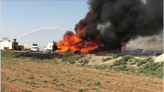 Mardin´in Kızıltepe- Nusaybin Karayolunda seyir halinde olan LPG yüklü tankerin lastiğinin patlaması sonucu lastikten yükselen kıvılcımlar LPG yüklü aracın alev almasına neden oldu.
