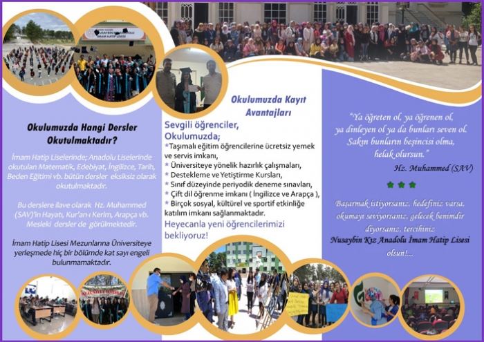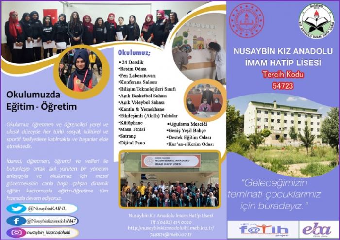 Nusaybin sadece kız öğrencilere yönelik eğitim - öğretim veren Kız Anadolu İmam Hatip Lisesi ise tanıtım broşüründe, taşımalı eğitim öğrencilerine ücretsiz yemek, üniversiteye yönelik hzırlık, destekleme ve yetiştirme kursları, sınıf düzeyinde periyodik deneme sınavları, ingilizce ve arapça öğrenme imkanları ile birçok sosyal, kültürel ve sportif etkinlikler, resim odası, fen laboratuvarı, bilişim teknolojileri sınıfı, açık basketbol ve voleybol sahaları tanıtımlarını yaptı.