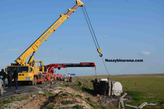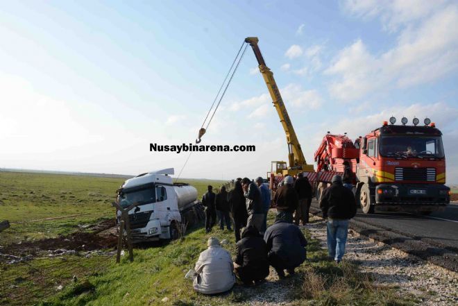 Kaza dün gece saat.03.00 sıralarında, Nusaybin - Kızıltepe arası ipek yolu üzeri Durakbaşı köyü mevkiinde meydana geldi. Osman Demir (33) yönetimindeki 63 L 0785 plakalı tanker, sürücünün direksiyon hakimiyetini kaybetmesi sonucu yoldan çıkarak mayınlı alana yuvarlandı. Kazadan yara almadan kurtulan sürücü Jandarmadan yardım istedi. Bölgeye gelen Jandarma ekipleri çevre güvenliği aldıktan sonra gündüz öğleden sonra Mardin`den gelen patlayıcı uzmanları alanda mayın taraması yaptı.Tanker, vinç yardımıyla mayınlı alandan çıkarıldı.Kazayla ilgili Jandarma soruşturma başlattı.-Haber-Ahmet Akkuş