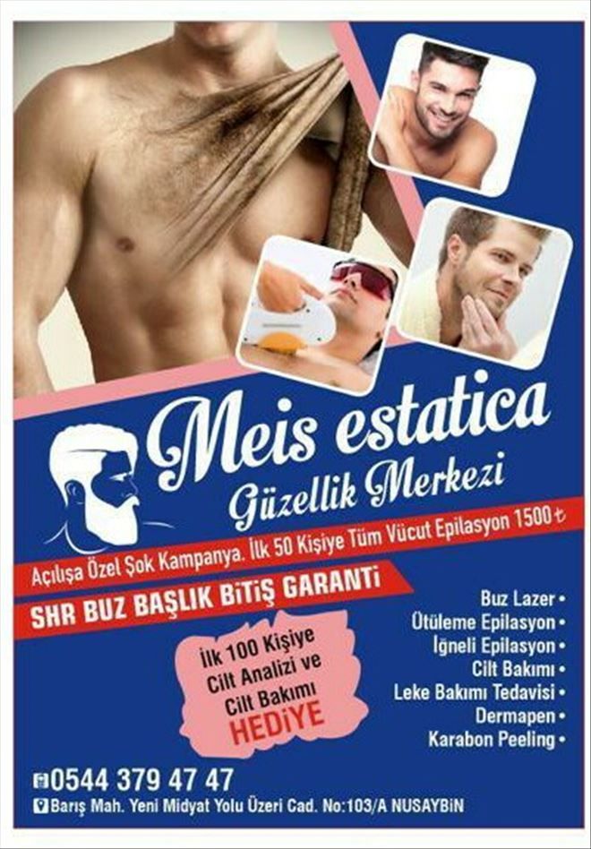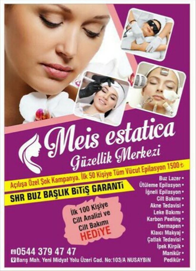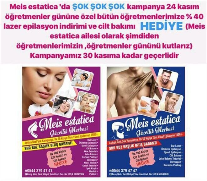 Nusaybin Meis Estatica´da şok şok şok kampanya 24 Kasım öğretmenler gününe özel bütün öğretmenlerimize % 40 lazer epilasyon indirimi ve cilt bakımı hediye. Meis Estatica ailesi olarak şimdiden öğretmenlerimizin, öğretmenler gününü kutlarız.