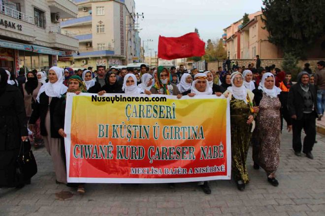 Nusaybin ilçesinde TUHAD-DER ve DBP öncülüğünde, Fırat Mahallesi Şirin Bulvarı’nda toplanan ve aralarında DBP ve HDP yönetimi, TUHAD-DER, KURDİ-DER, MEYA-DER, Barış Anneleri İnisiyatifi üyeleri, DÖKH Aktivistleri yanı sıra çok sayıda kişi çağ çağ caddesinden Mitanni Parkı’na doğru yürüyüşe geçti. Yürüyüşte kitle sık sık PKK ve PKK Lideri Abdullah Öcalan lehine sloganlar ile Suriye sınırına kadar yürüdü.Sınıra 20 metre mesafede duran kalabalık adına açıklama yapan Nusaybin TUHAD-DER temsilcisi M.Emin Alkan, AKP hükümeti ile Sayın Öcalan arasında ‘çözüm’ adı altına görüşmelerin sürdüğünü ifade ederek; “Bu sıralarda AKP Hükümeti çözüm için hiçbir adım atmıyor. Sürecin olumlu sonuçlanması ve çözüme kavuşturulması için bir adım atmazken tam aksine süreci baltalamaya çalışıyor. Bu süreç içerisinde olmayan bir şey kalmadı, Kalekol, Karakol, Baraj, Termik Santraller yapıldı ve yapımları hala devam ediyor” dedi.