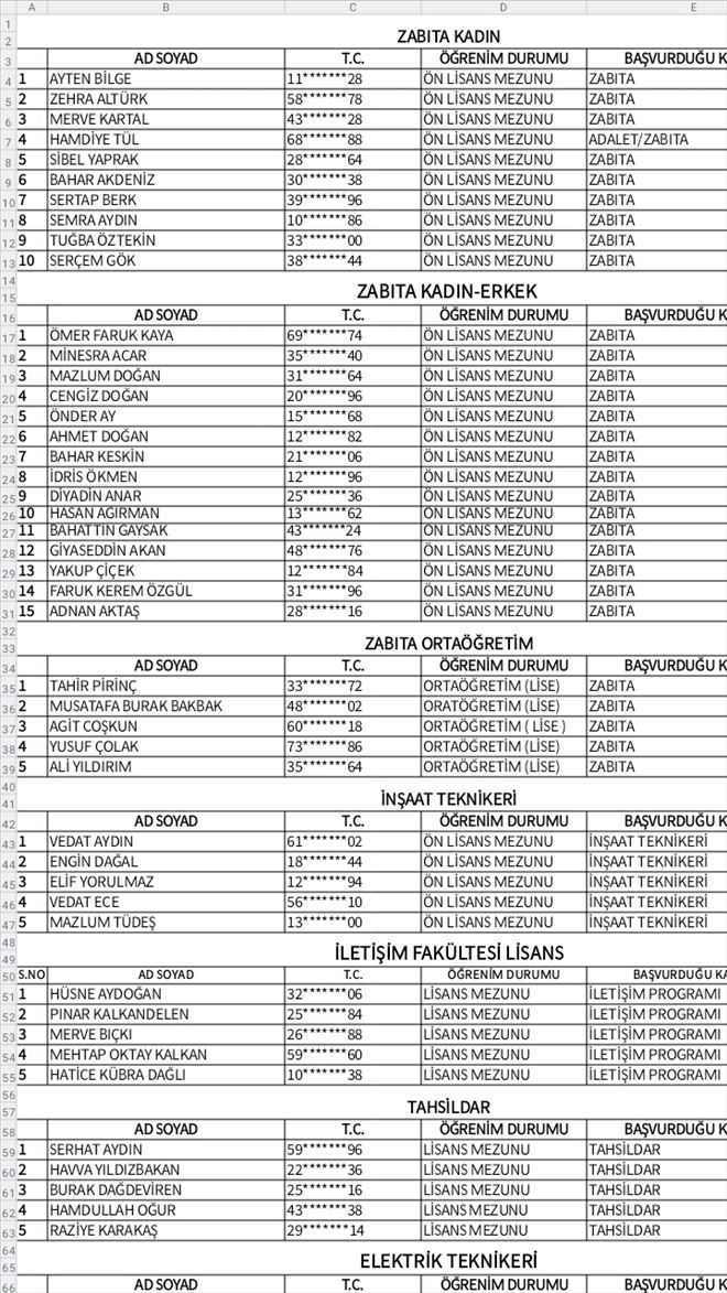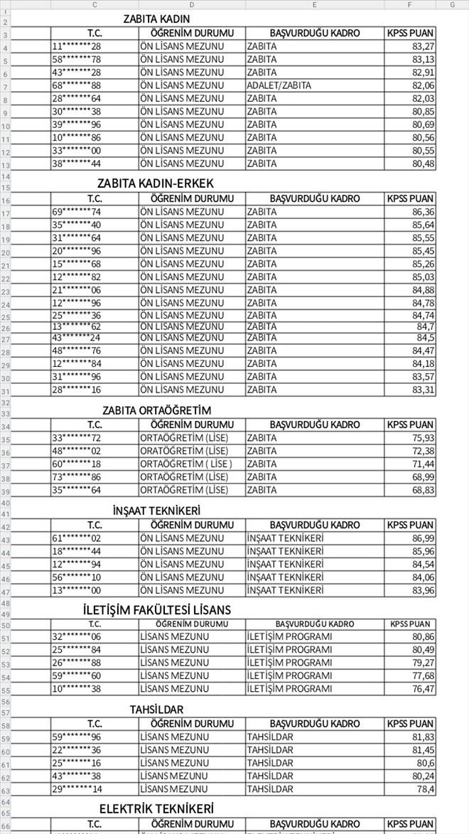11 BAHATTİN GAYSAK 43*******24 ÖN LİSANS MEZUNU ZABITA 84,5