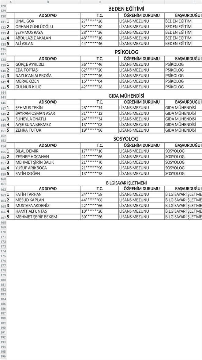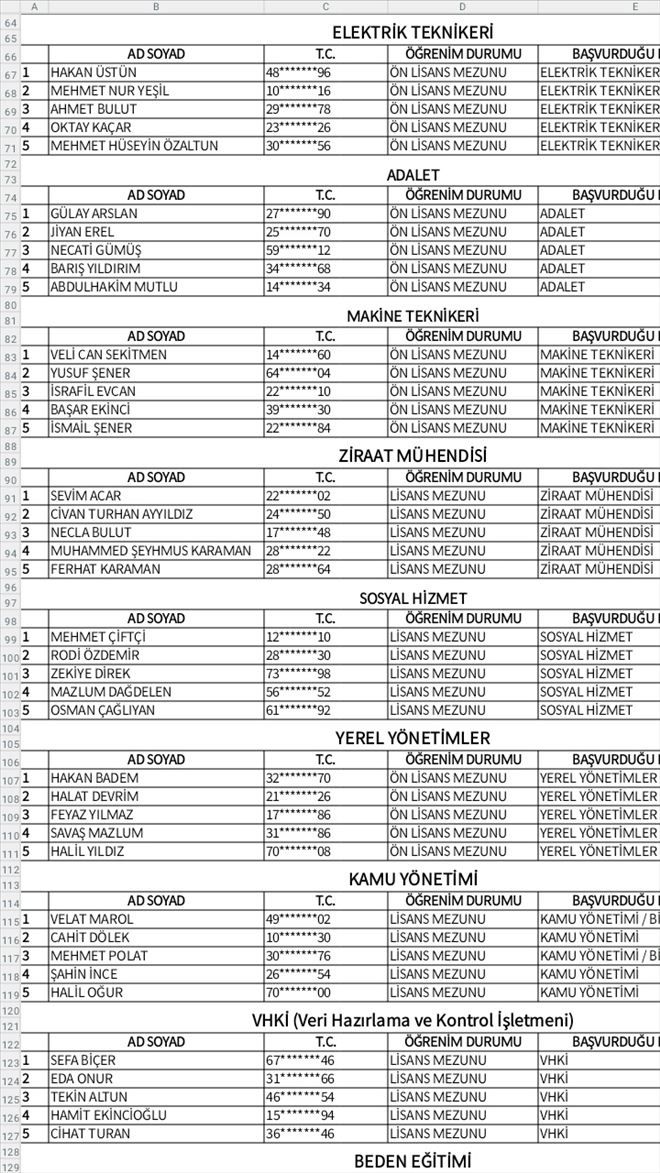 5 İSMAİL ŞENER 22*******84 ÖN LİSANS MEZUNU MAKİNE TEKNİKERİ 74,51