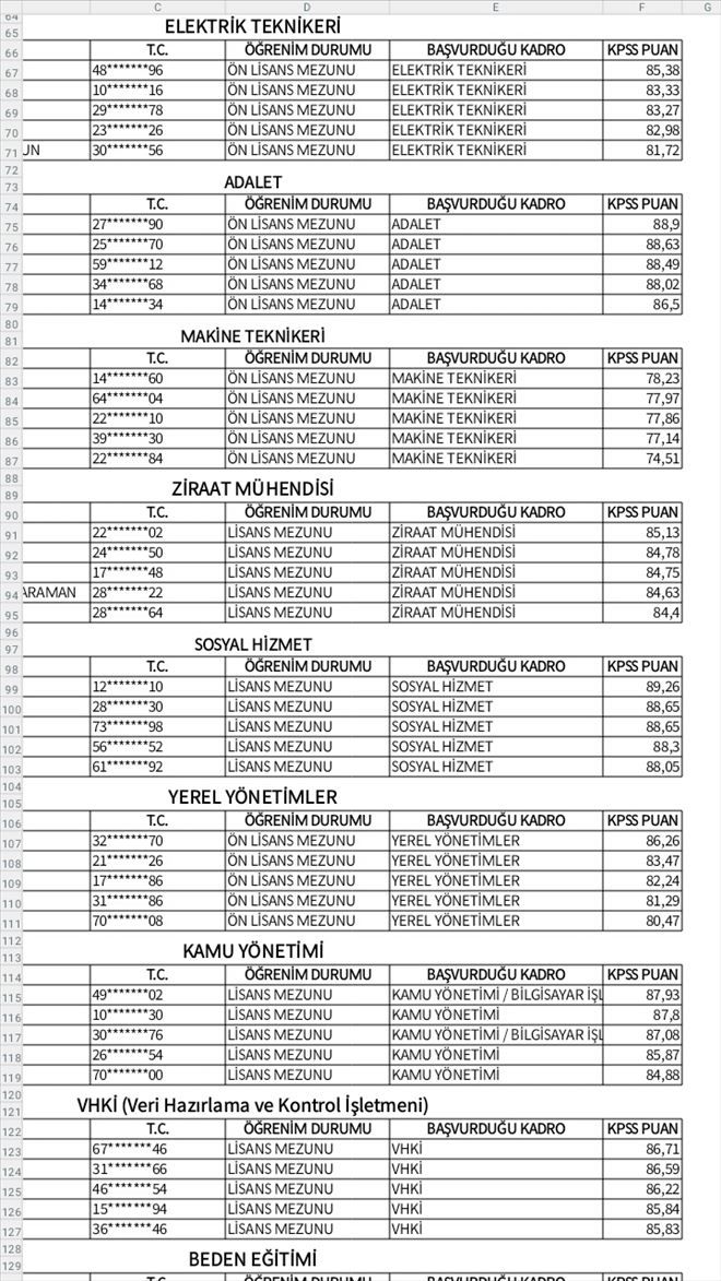 4 OKTAY KAÇAR 23*******26 ÖN LİSANS MEZUNU ELEKTRİK TEKNİKERİ 82,98
