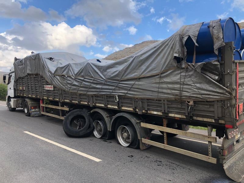 Kazada Tır’ın arka dorsa sının 4 tekerleği top atarak patlarken otomobil kullanılamaz hale geldi.