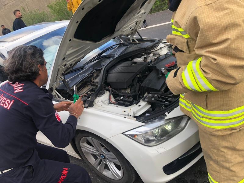 Kazada kullanılamaz hale gele otomobilin yanması ihtimali üzerine Arama ve Kurtarma ekibi güvenlik önlemleri aldı.