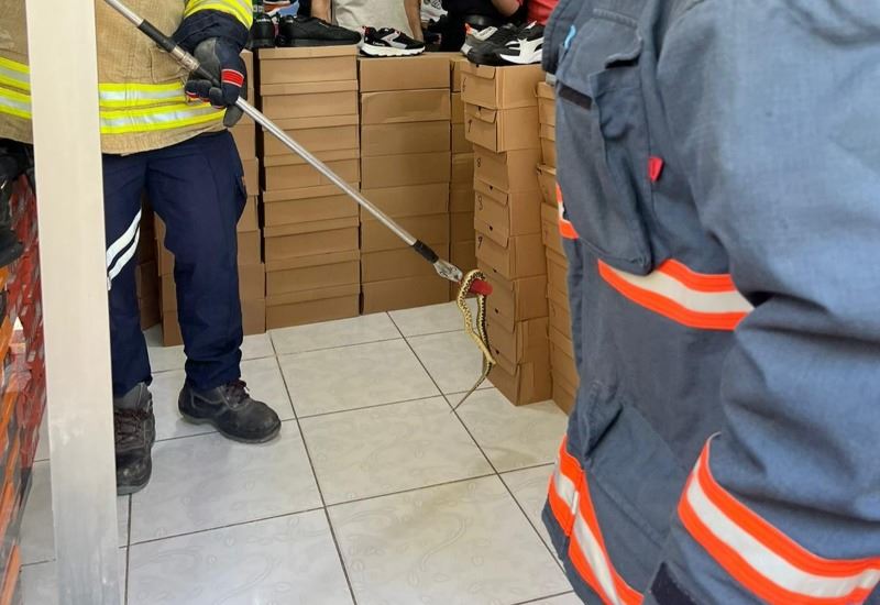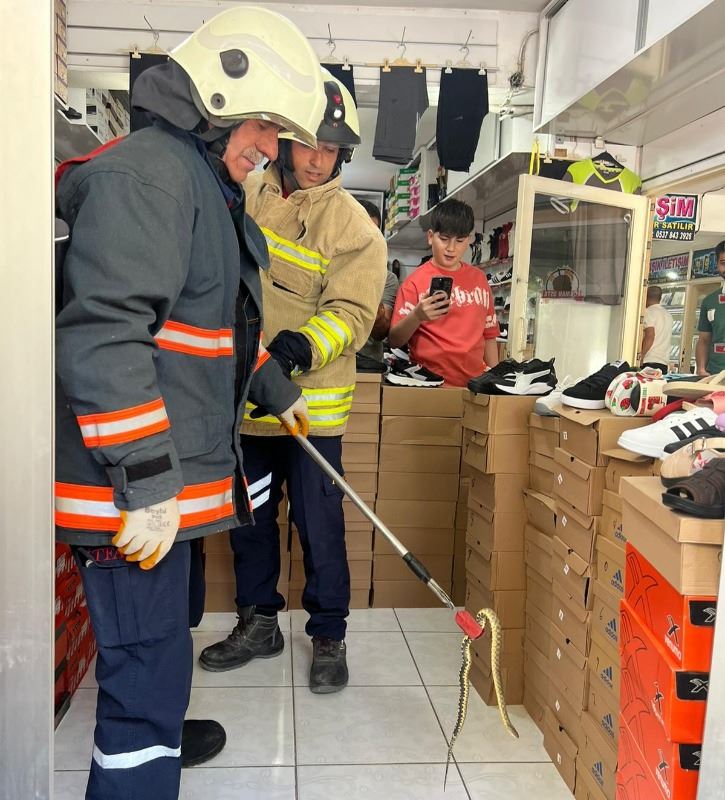 Yılanın kimseyi ısırmadan yakalanmasına sevinen işyeri sahibi itfaiye ekiplerine teşekkür etti.
