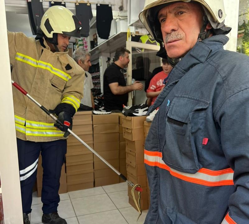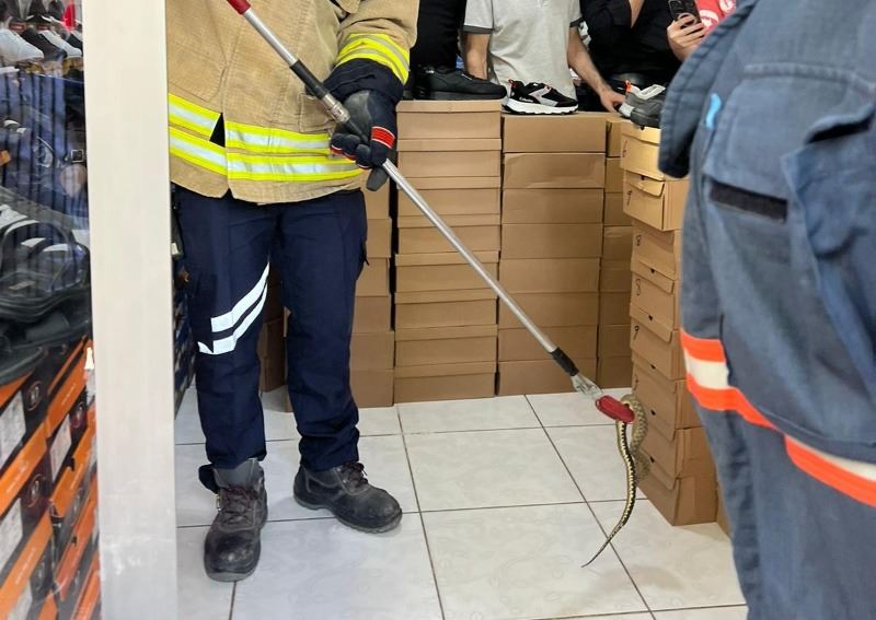 Ahmet AKKUŞ/Mardin’in Nusaybin ilçe merkezinde bulunan bir ayakkabı mağazasına yaklaşık bir metre uzunluğunda yılan girdi.