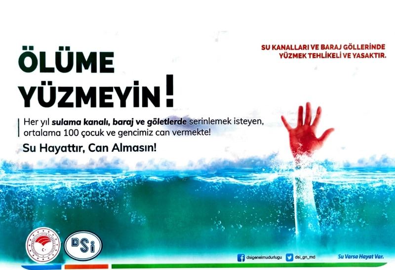 “Havaların ısınmasıyla birlikte baraj, gölet, sel kapanı, regülatör, sulama kanalı gibi su depolama ve iletim tesislerine serinlemek ve yüzmek için giren vatandaşlarımızın sayısında artış gözlemlenmektedir. Su depolama ve iletim tesisleri yüzmek ve serinlemek için son derece uygunsuz tesisler olup bu tesislere girilmesi ölümcül neticeler doğurmaktadır.