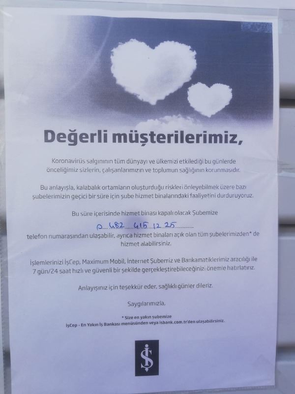 İş Bankası Nusaybin Şubesine asılan duyuruda, "Değerli Müşterilerimiz, Koronavirüs salgının tüm dünyayı ve ülkemizi etkilediği bu günlerde önceliğimiz sizlerin, çalışanlarımızın ve toplumun sağlığının korunmasıdır.