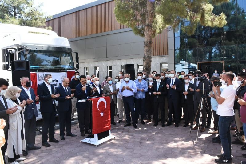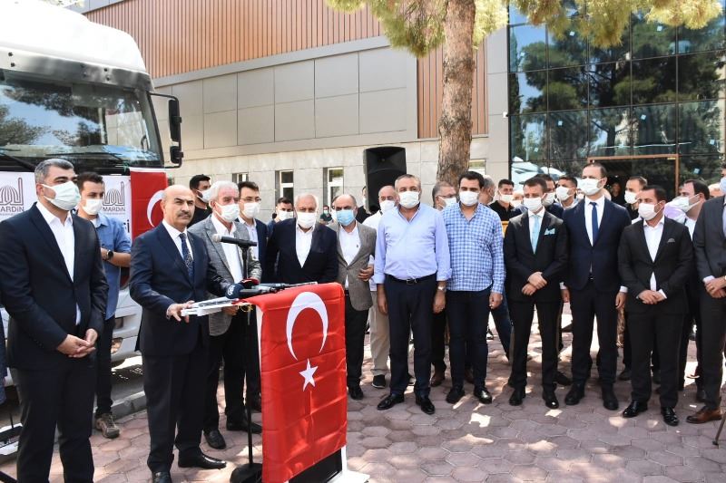 Mardin Organize Sanayi Bölgesi'nde yapılan yardım konvoyu uğurlama törenine Mardin Valisi ve Büyükşehir Belediye Başkan V. Mahmut Demirtaş, İlçe Kaymakamları, Belediye Başkanları ve STK temsilcileri katıldı.