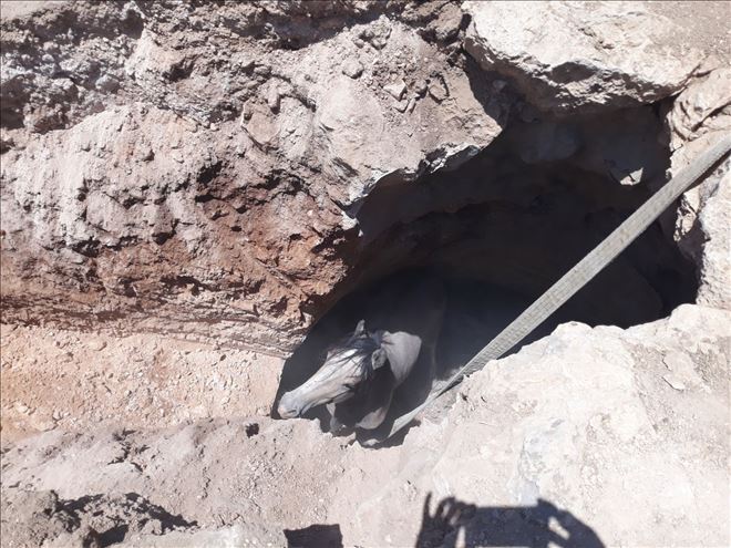 Mardin´in Nusaybin ilçesinde, kuyuya düşen at, bir gün sonra, kuyunun ağzının iş makineleriyle genişletilmesinin ardından itfaiye tarafından kurtarıldı.