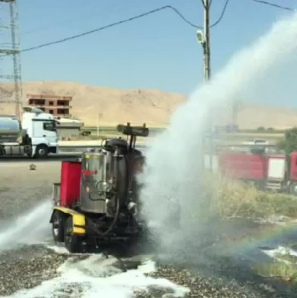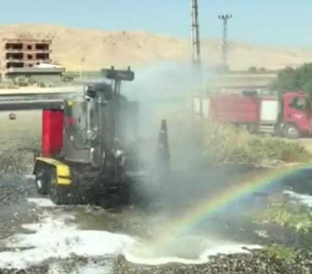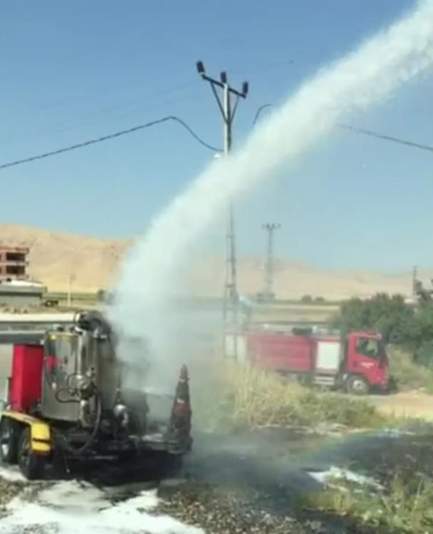 Nusaybin ilçesinde yol çalışmalarında kullanılan asfalt makinesi yandı.
