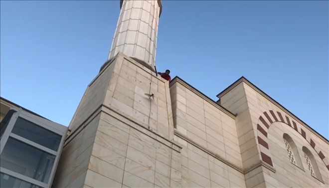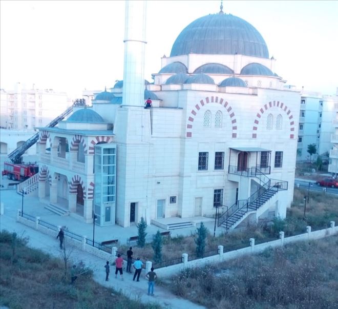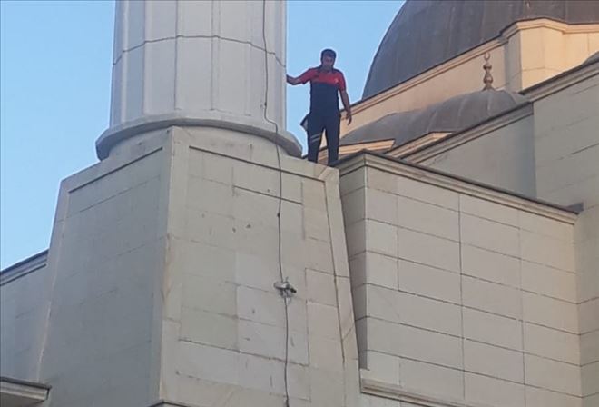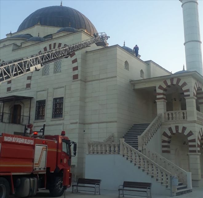 ipe asılı olarak camii tepesinde güvercini gören vatandaşlar, Mardin Büyükşehir Belediyesi´ne bağlı Nusaybin itfaiye ekiplerine haber verdi.