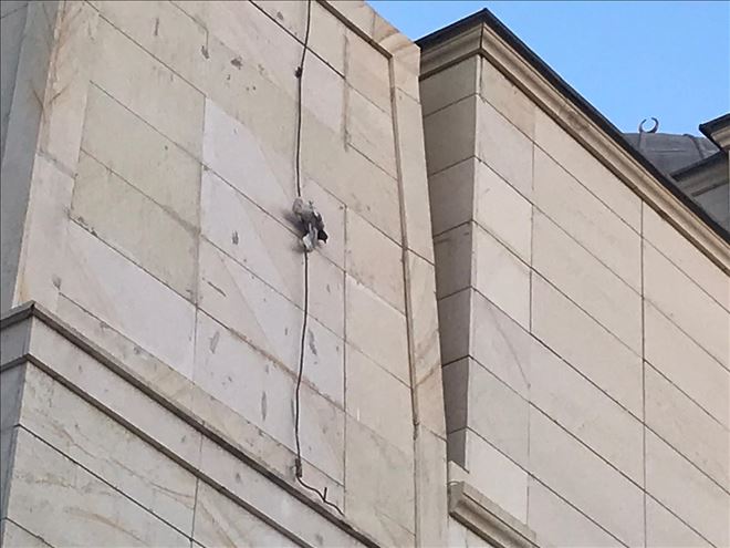 Nusaybin´de camiinin tepesinde ayağına ip dolanan güvercini asılı kaldı