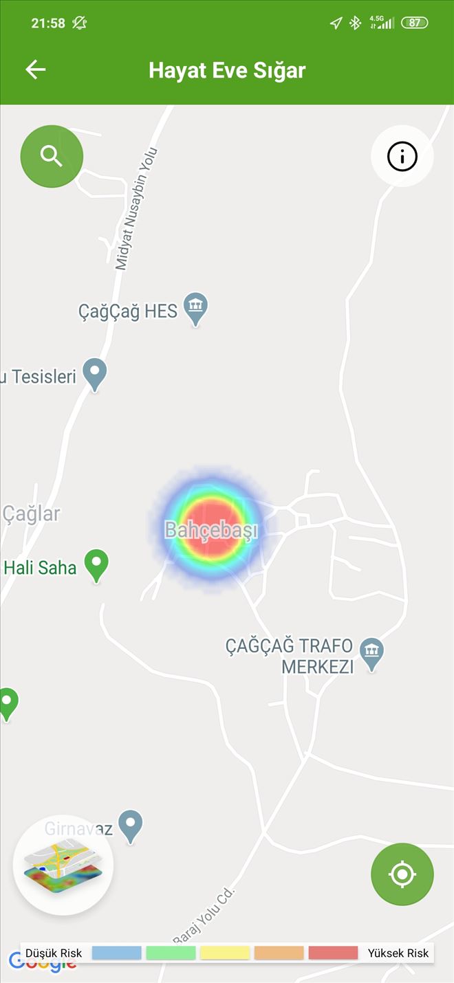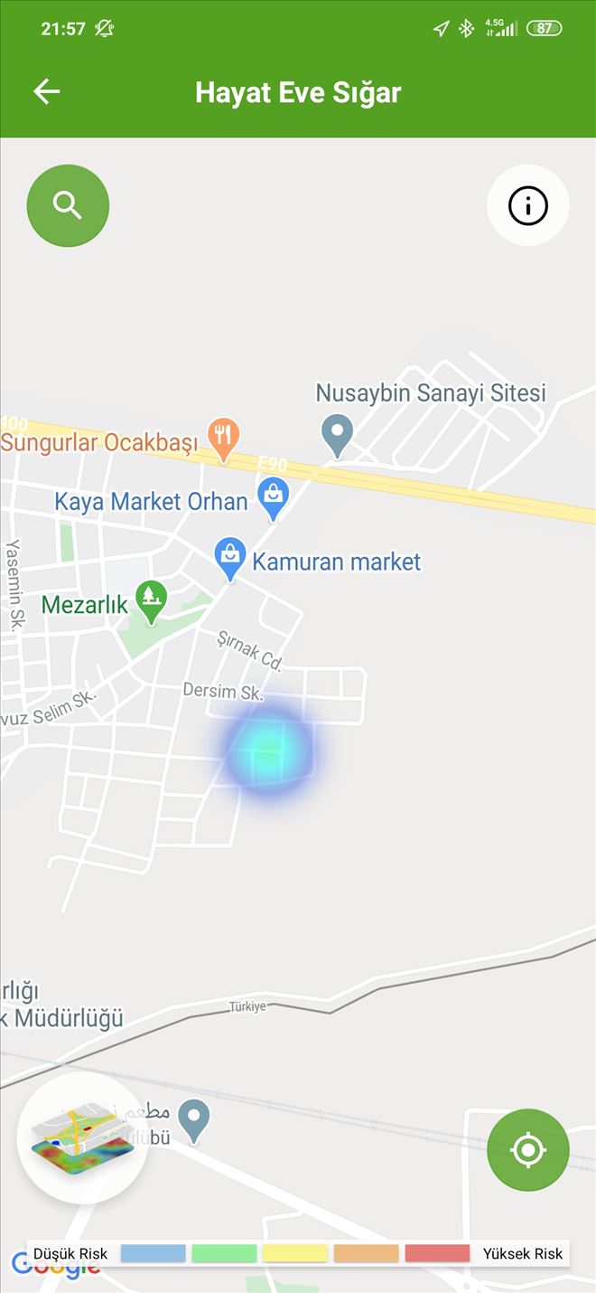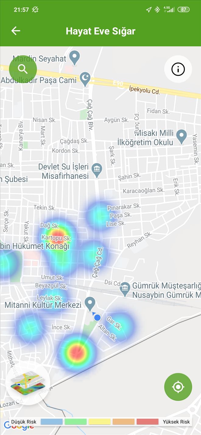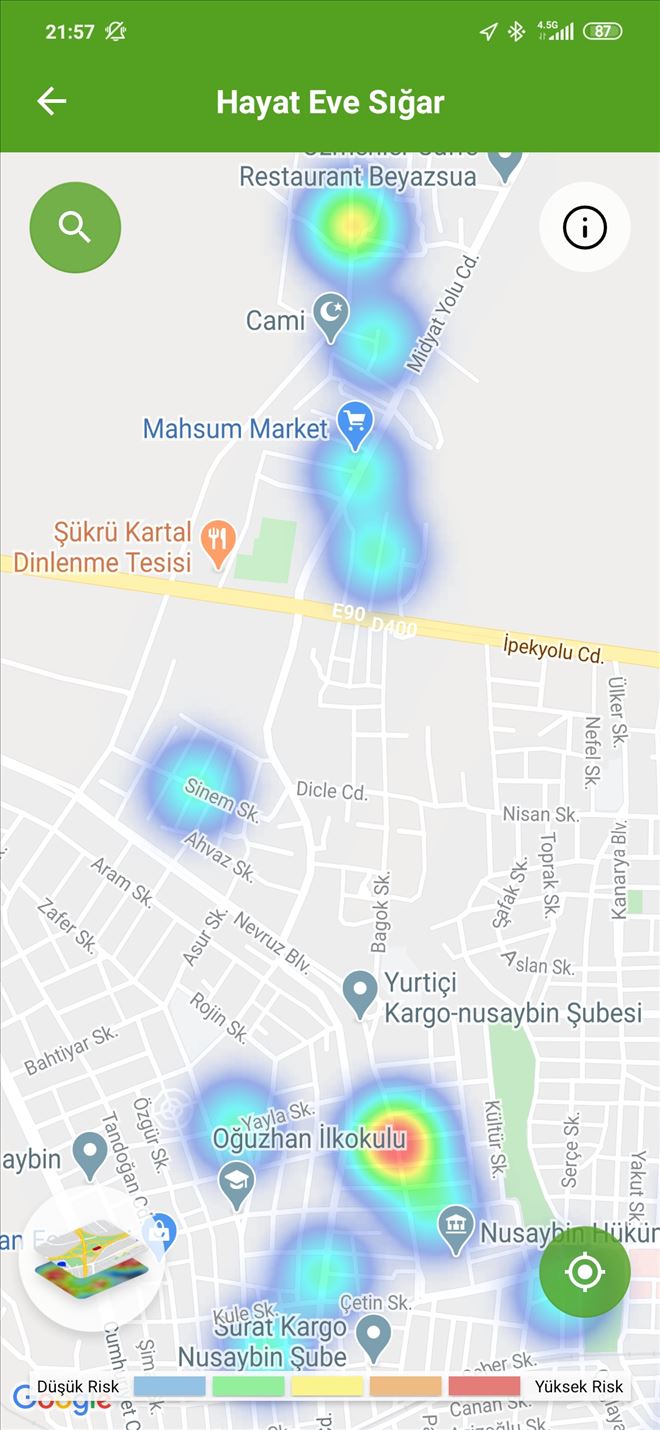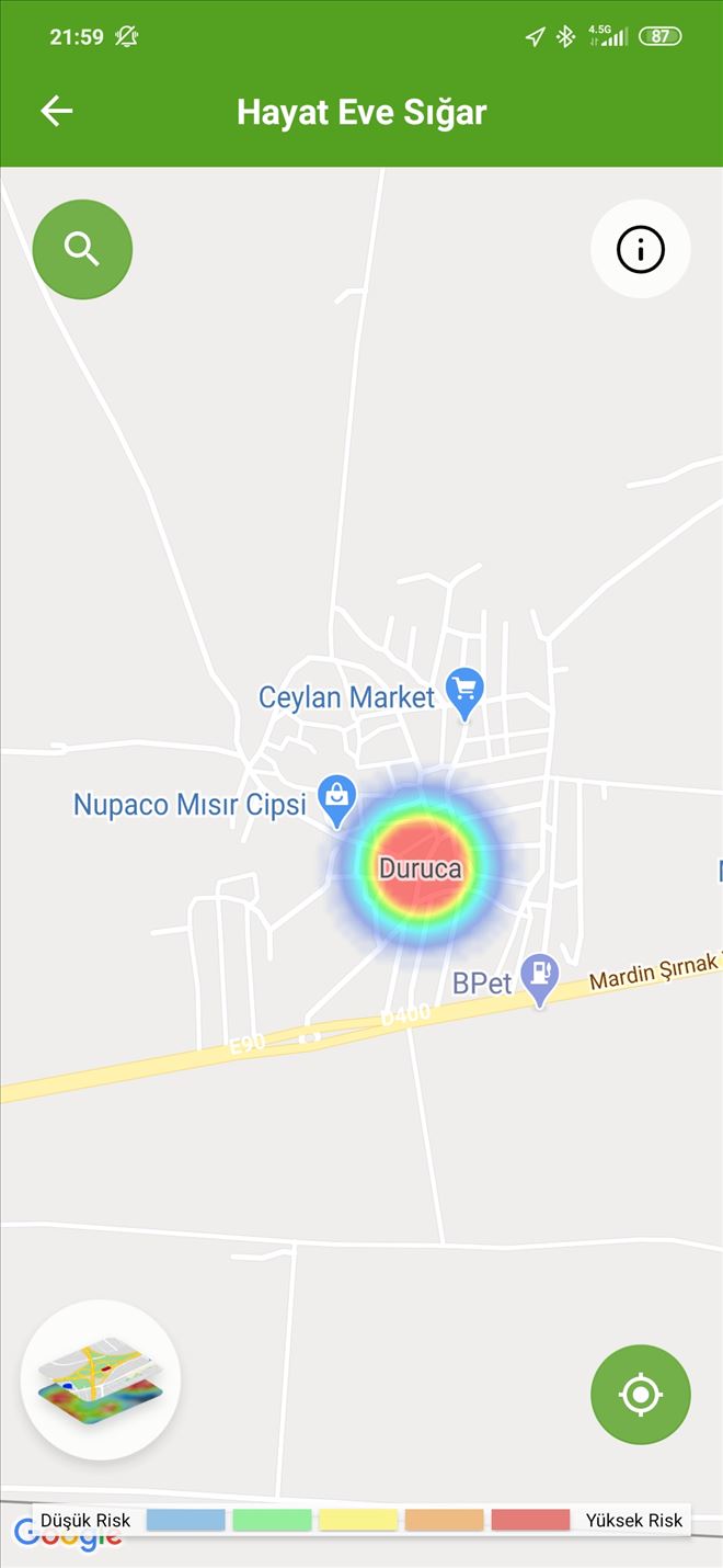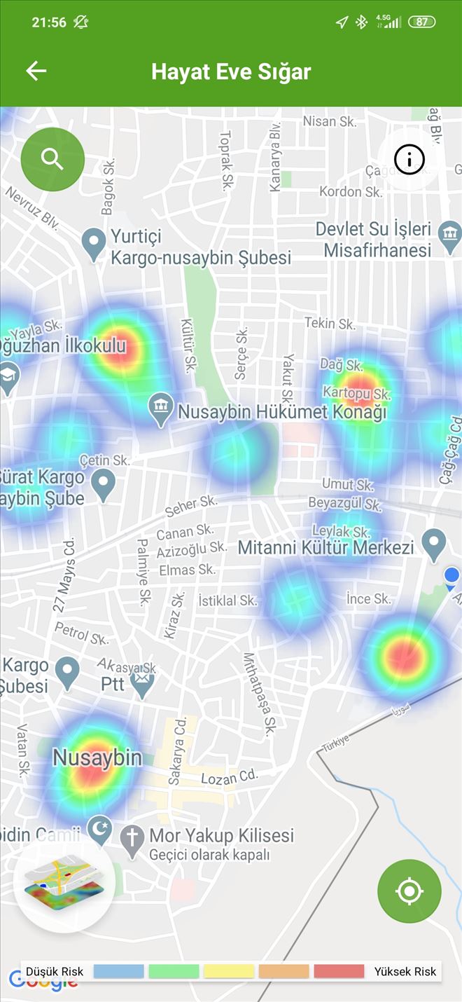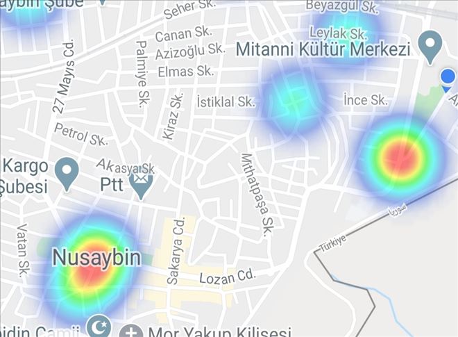 Mardin´in Nusaybin ilçesinde, "Hayat Eve Sığar" uygulamasından Nusaybin ve köylerindeki Coronavirüs vakaları olduğu bölgeleri kırmızı, sarı, yeşil ve mavi olarak baka çokluğunu işaretlenmiş.