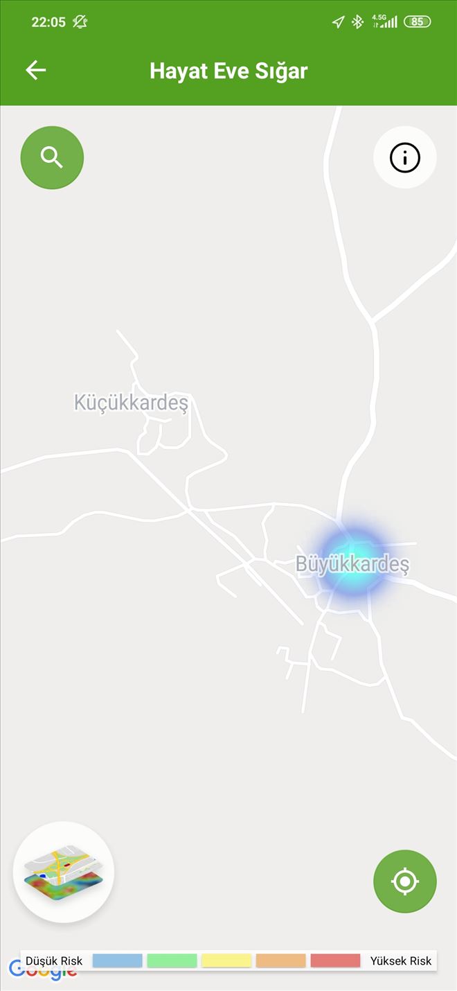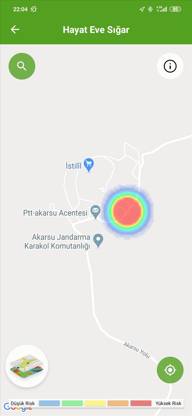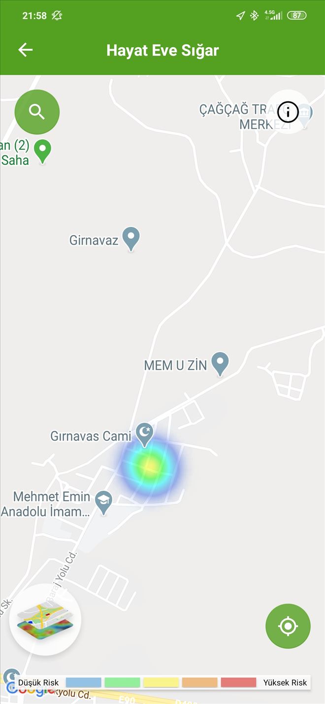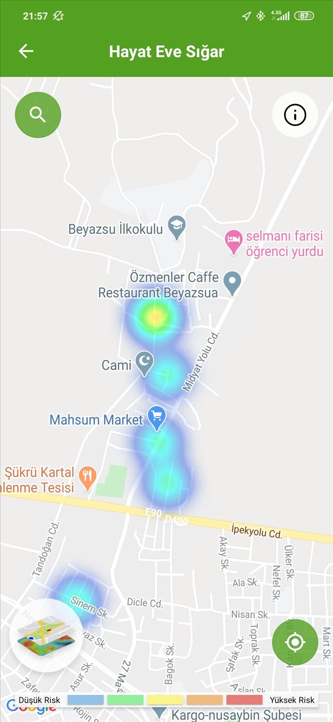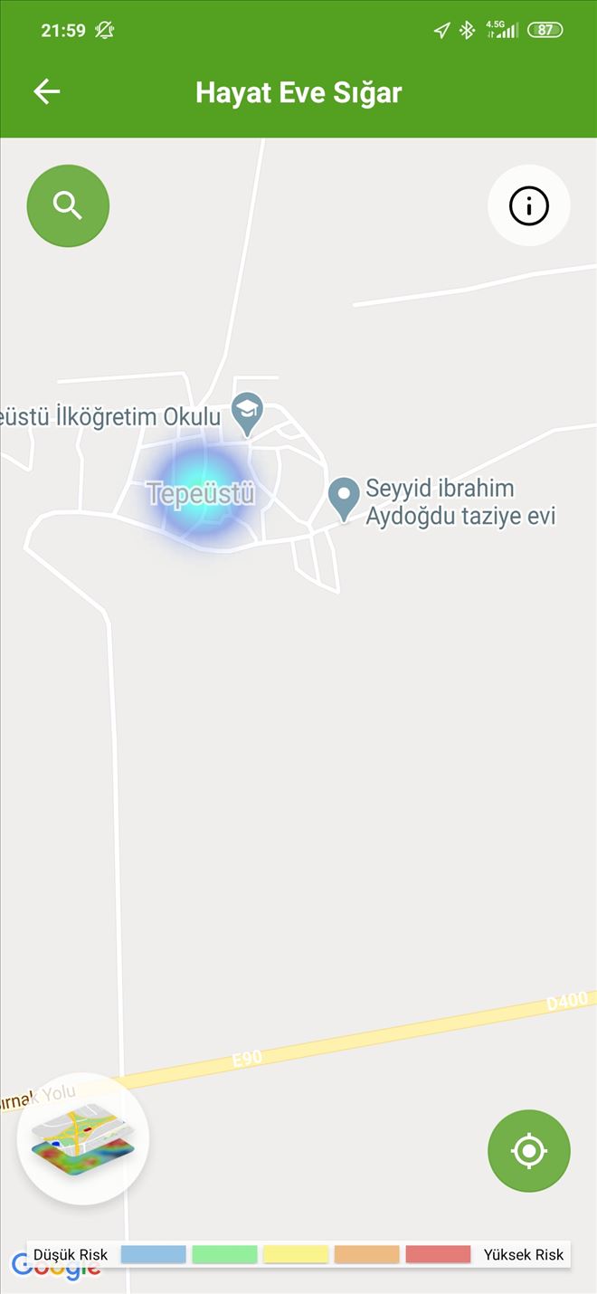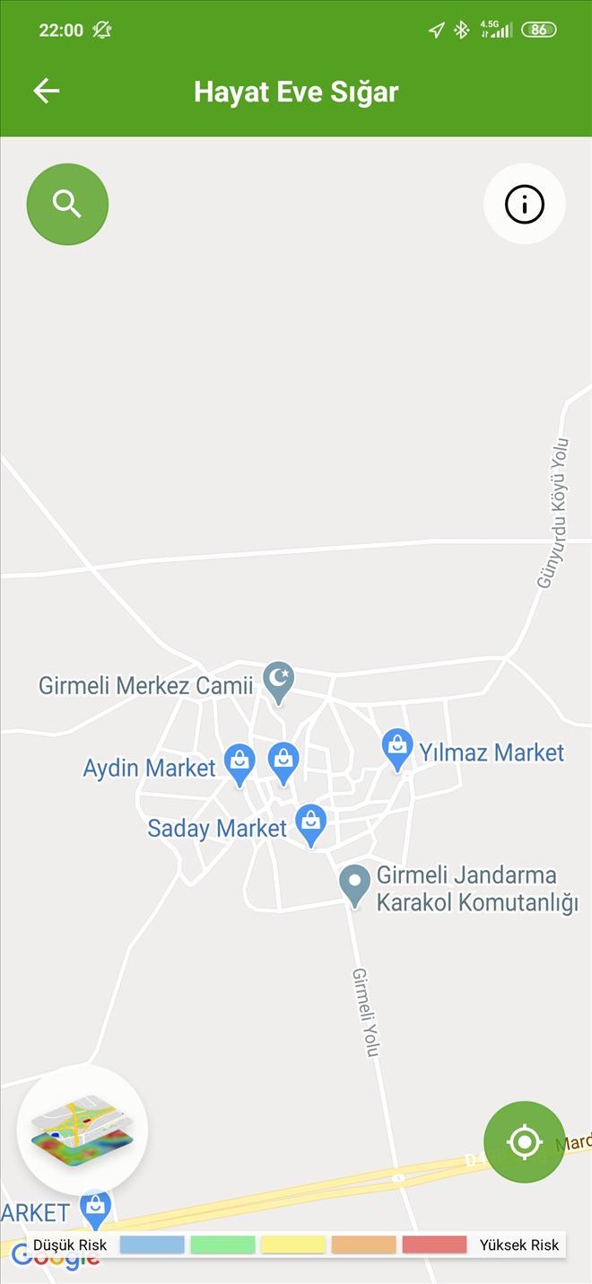 Mardin´in Nusaybin ilçesinde, "Hayat Eve Sığar" uygulamasından Nusaybin ve köylerindeki Coronavirüs vakaları olduğu bölgeleri kırmızı, sarı, yeşil ve mavi olarak baka çokluğunu işaretlenmiş.