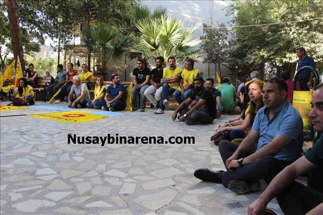 KESK Nusaybin şubesinde bir araya ve aralarında HDP Mardin milletvekili Ali Atalan ile görevden alınan Nusaybin Belediye Eş Başkanı Cengiz Kok´un da olduğu grup, Barış Parkında açıklama yaptı.