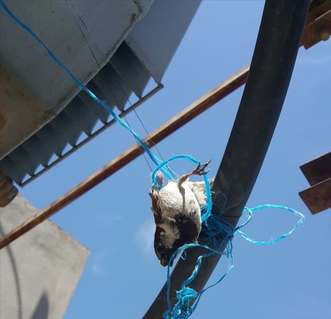 Elektrik arıza ekipleri, trafosuna tepesine merdiven uzatarak kuşu bağlı olduğu ipten kurtardıktan sonra bırakarak özgürlüğüne kavuşturdu.