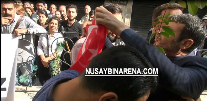 Basın açıklaması öncesi polis ekipleriyle KESK Genel Başkanı Bozgeyik arasında yapılan görüşme sonrası KESK binası önünde açıklama yapılmasına izin verildi. Basın açıklaması yapılması için hazırlık yapıldığı sırada grubun önüne gelen bir kişi, gruptakilere yönelik, "Sivillere, Nusaybin halkına bomba, havan atan terörü mü destekleyeceksiniz? Ben vatandaşım, Nusaybinliyim. İhanet ettiğiniz bayrağın altında yaşamayacaksınız" dedi. Bu sırada polis ekipleri araya girerek şahsı bölgeden uzaklaştırmaya çalışırken göğsüne sakladığı Türk Bayrağını çıkararak tepki gösterdi.