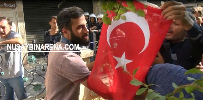 MARDİN´in Nusaybin ilçesinde basın açıklaması yapan HDP Milletvekilleri, KESK Emek ve Demokrasi Platformu üyelerin önüne gelen bir kişi göğsünden çıkardığı Tük Bayrağıyla tepki gösterdi.