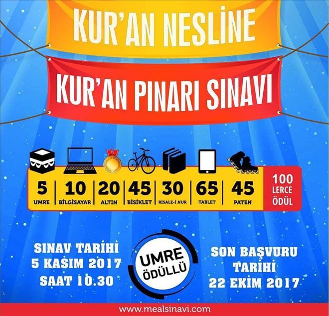 Konuyla ilgili açıklamalarda bulunan Kur´an Nesli Platformu üyesi Düşünce Kültür ve Dayanışma Derneği başkanı Metin KARDAŞ Türkiye genelinde 5 Kasım günü yapılacak umre ödüllü ?Kur´an Pınarı Sınavı? hakkında bilgilendirmelerde bulunarak, sınava başvuru tarihlerinin 23 Eylül-22 Ekim 2017 arasında olduğunu bildirdi.
