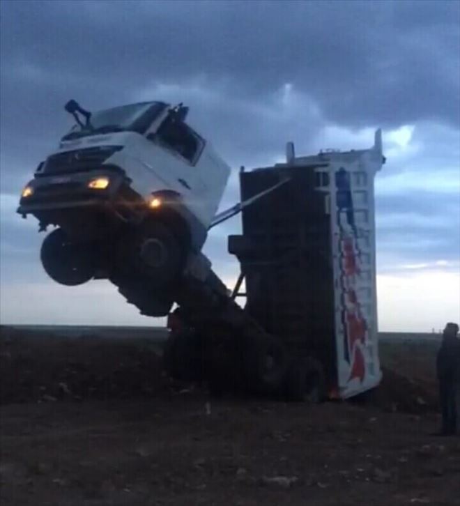 Mardin´in Nusaybin ilçesinde bir kamyon sürücüsü, yüklediği toprak´ı boşaltmaya çalışınca kamyon saha kalkarak saatlerce araçtan inmeyerek mahsur kaldı.