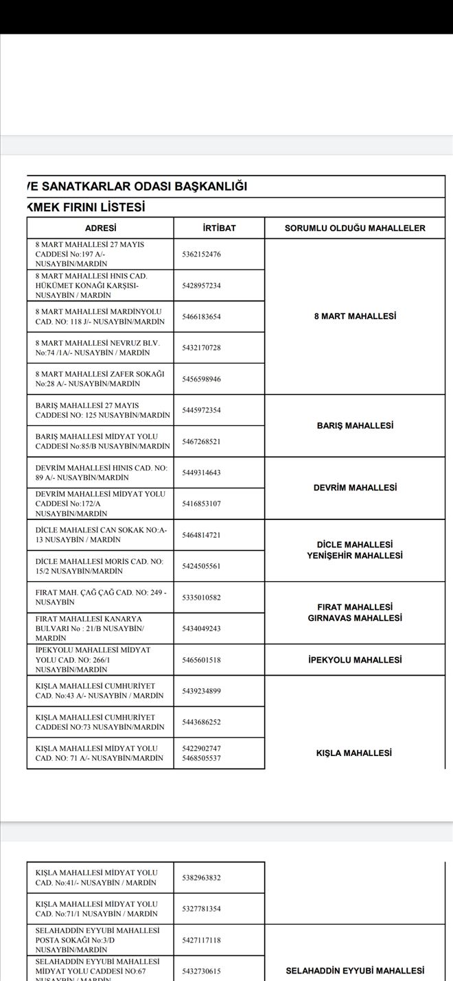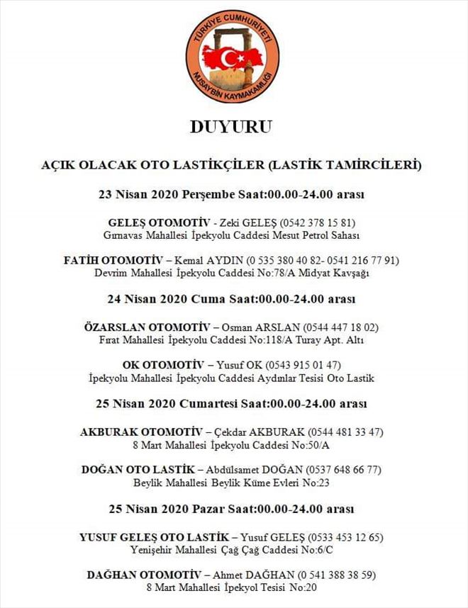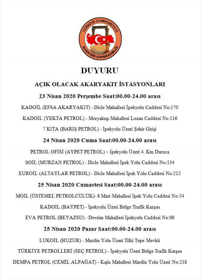 Nusaybin´de Sokağa çıkma yasağında açık olacak olan, Akaryakıt istasyonları, Oto lastik tamircileri ve Ekmek fırınların adres ve iletişim listesi.