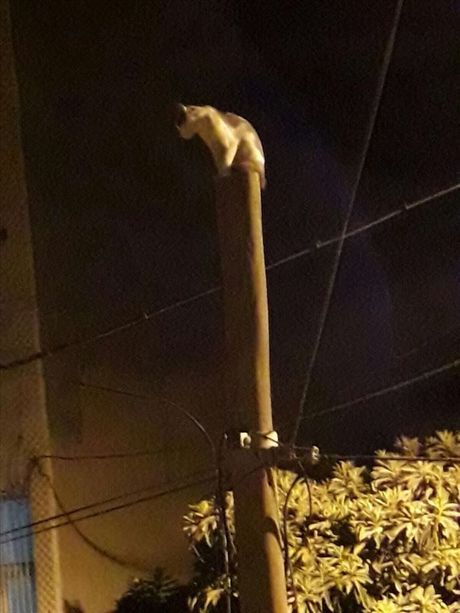 Mardin´in Nusaybin İlçesi´nde çıktığı telefon direğinin tepesinde mahsur kalan kedi, mahalle sakinlerinin çağırdığı itfaiye ekiplerini görünce direkten atlayarak karanlıkta ortadan kayboldu.