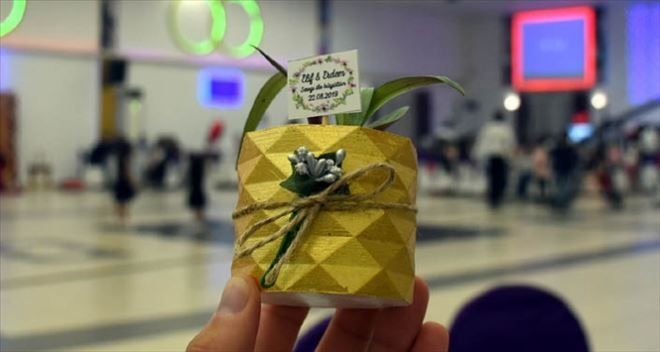 Düğüne katılan misafirlere hediyelik fidan verildi.