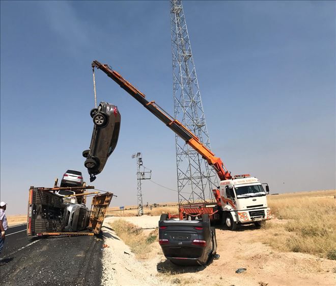Mardin´in Nusaybin ilçesi ipekyolunde, sıfır otomobil yüklü Tır dorsası devrildi, 6 yeni otomobilden 4´ü zarar gördü.