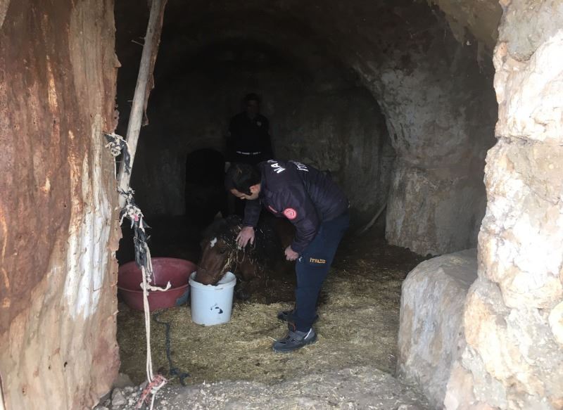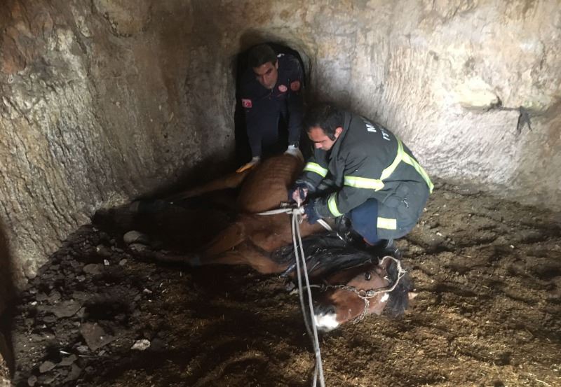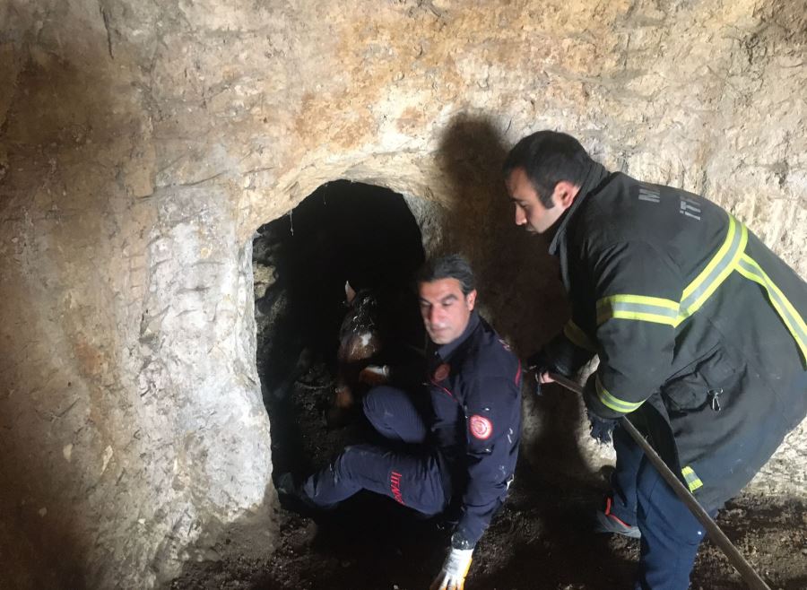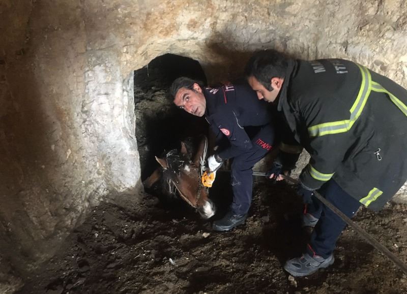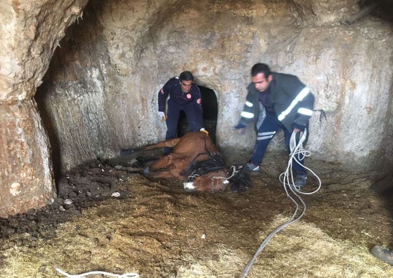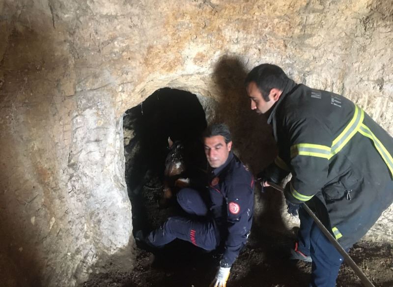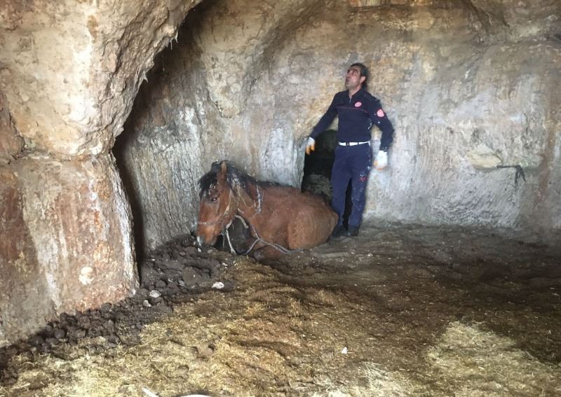 İhbar üzerine bölgeye giden İtfaiye ekipleri, uzun uğraşlar sonucu atı mağaradan çıkararak sahibine teslim etti.