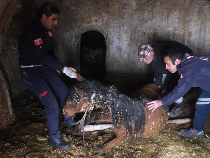 Nusaybin’de 2 gün mağarada mahsur kalan at, itfaiye ekipleri kurtardı