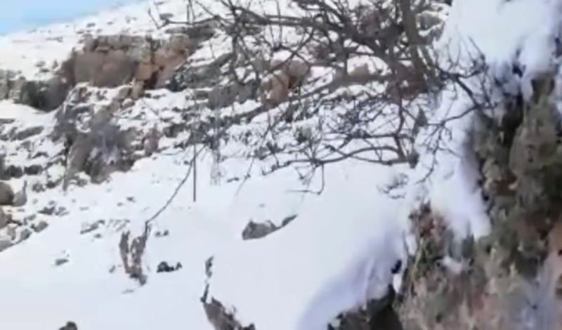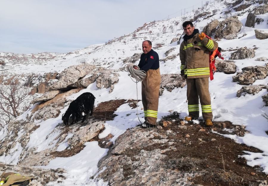 Ahmet AKKUŞ/-MARDİN’in Nusaybin ilçesinde dağlık bölgesindeki uçurum kayalıklarında 3 gün mahsur kalan 2 keçiyi itfaiye ekipleri 5 kilometre, yaklaşık 50 santimlik kar üzerinde yürüdükten sonra kayalıklara iple inerek keçileri kurtardı.