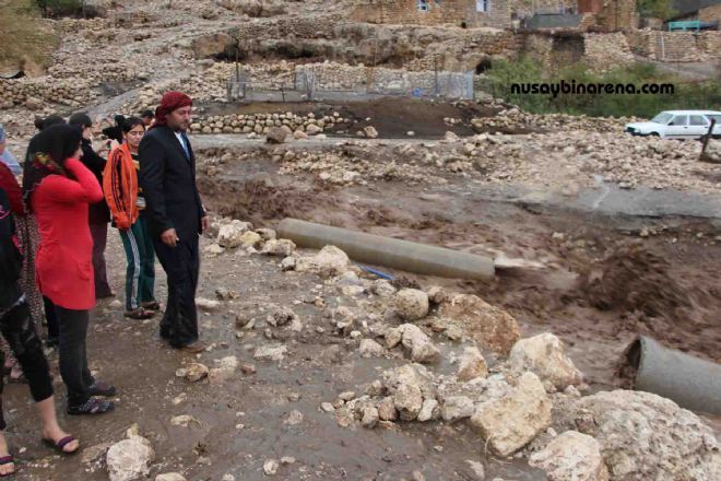 Nusaybin’in Eskihisar (Marînê) Mahallesi’nde dün akşam ve gündüz saatlerinde etkili olan bilye büyüklüğünde dolu ve ardında yağmur suları sel sularına dönüşmesi nedeniyle köyde büyük panik yaşandı. Oluşan sel suları sonucu mahalledeki 3 ev sular altında kalarak kullanılamaz hale gelirken evlerle beraber bazı ağır ve kümeslerde sel sularıyla doldu. Buralarda bulunan onlarca küçükbaş ve kümes hayvanı ise sel suları yüzünden telef oldu.Evi su altında kalan cami imamı İhsan Bozkurt, yağmurun yağmaya başladığı sırada camide olduğunu belirterek "Önce yağmur yağdı daha sonra beraberinde dolu yağmaya başladı. Camide mahsur kaldım. Sel kalktı. Bütün hayvanlarımız telef oldu. Ailem evin içinde mahsur kaldı. Ölümden döndüler. Camide olduğum için yardımlarına gidemedim. Komşular, ailemi evden çıkarmışlar. Köyde hasar büyük" şeklinde konuştu.