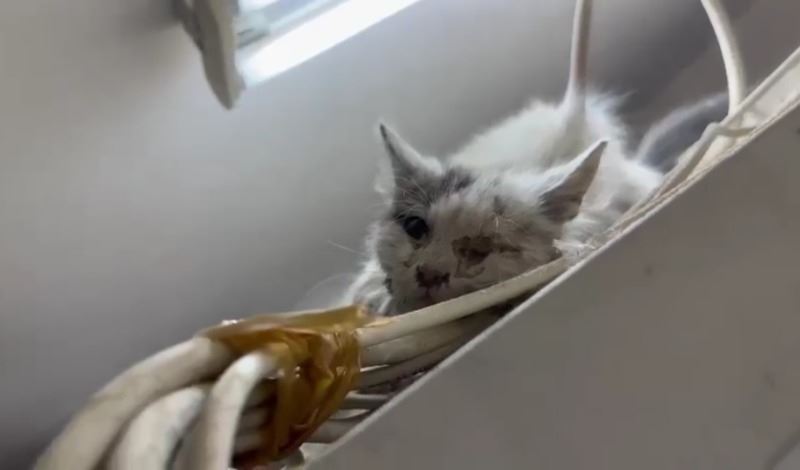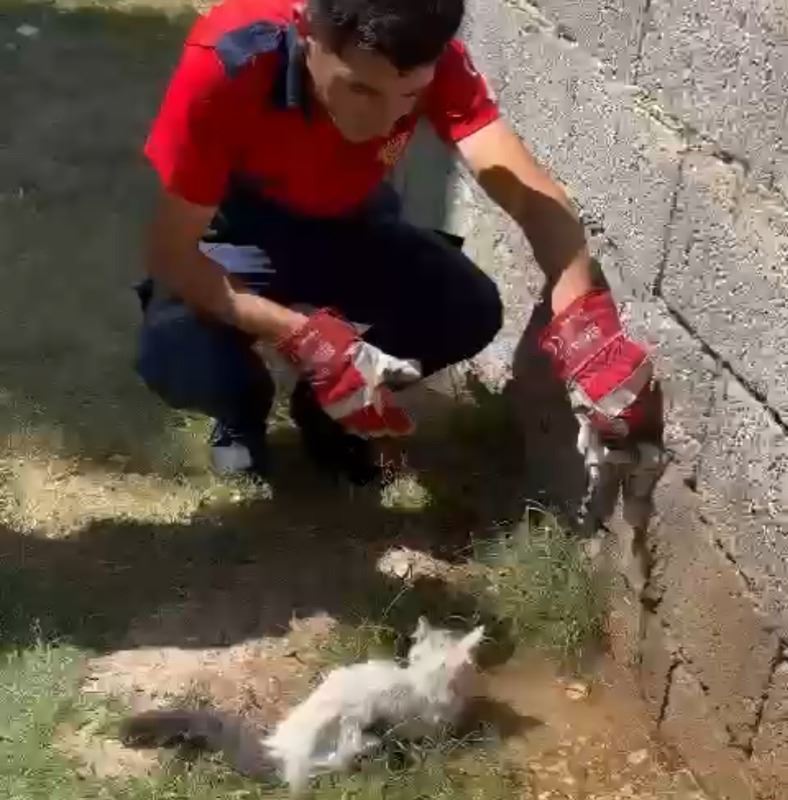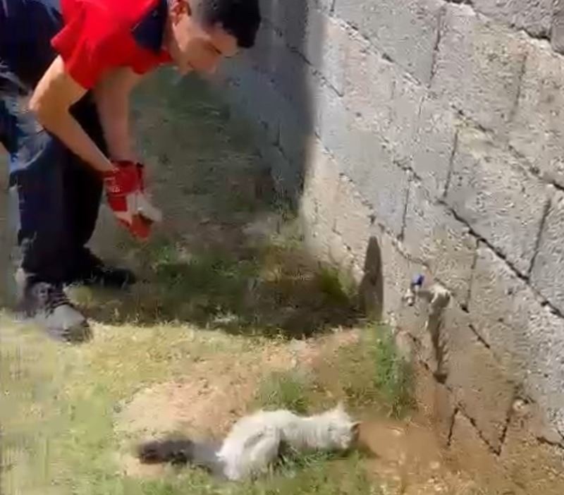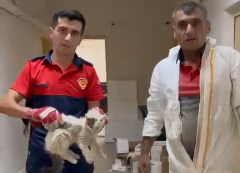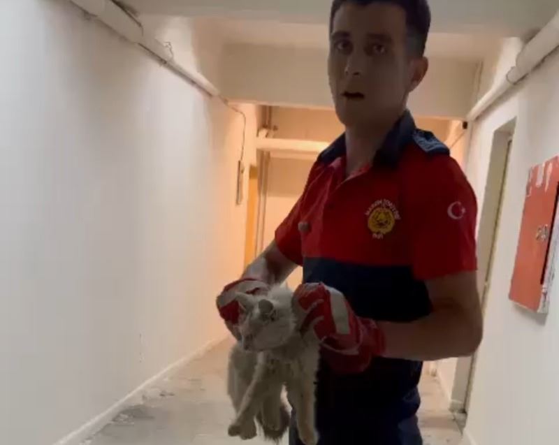 İhbar üzerine bölgeye Arama Kurtarma ekibi sevk edildi. Ekipler, soğuk hava deposunun arkasına girerek mahsur kalan kediyi özel bir aparatla çıkardı. Kurtarılan kedi aç ve bitkin halde itfaiye eri kucağına alarak bahçede bulunan su musluğunu açarak kedinin su içmesini sağladı. Orada bulunanlara aç kalan kediye yemek verilmesini istedi. Kedi sağlık ocağın bahçesine bırakıldığı öğrenildi.