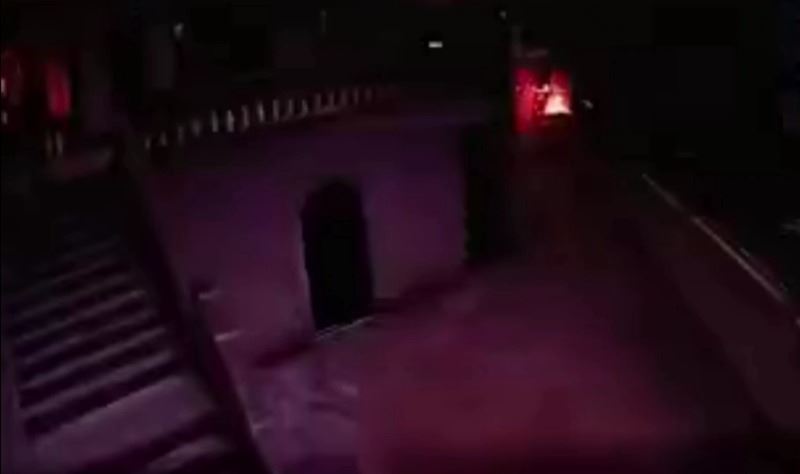 Camii minaresine düşen yıldırım güvenlik kamerasına böyle yansıdı. Yıldırım, düşmeden önce küçük bir kızın babasını çağırmak için camii merdivenlerinden çıkarken patlamayla birlikte büyük bir patlamayla yere düşen alev görülürken camii elektrikleri kesildiği görüntülere yansıdı.